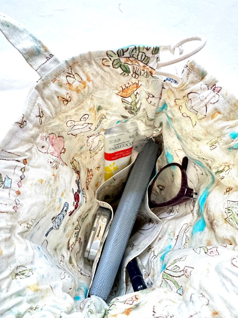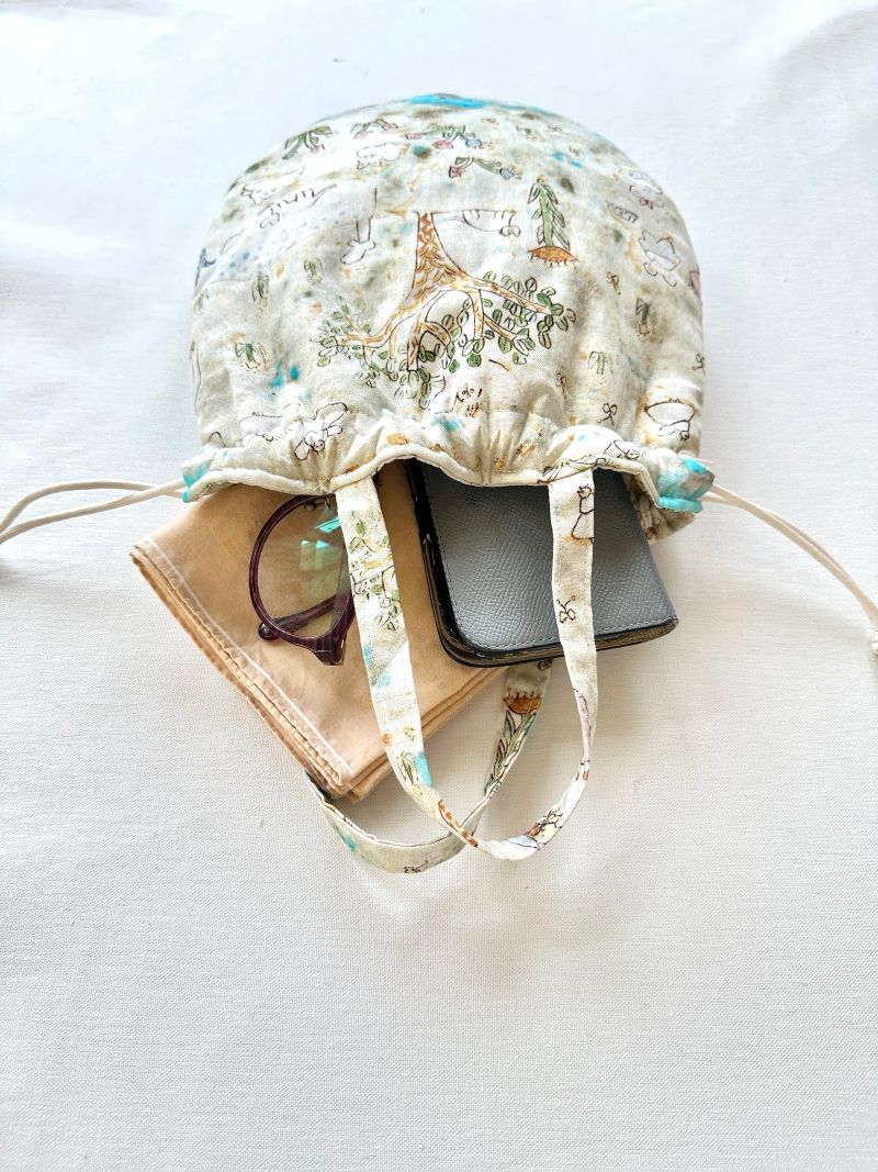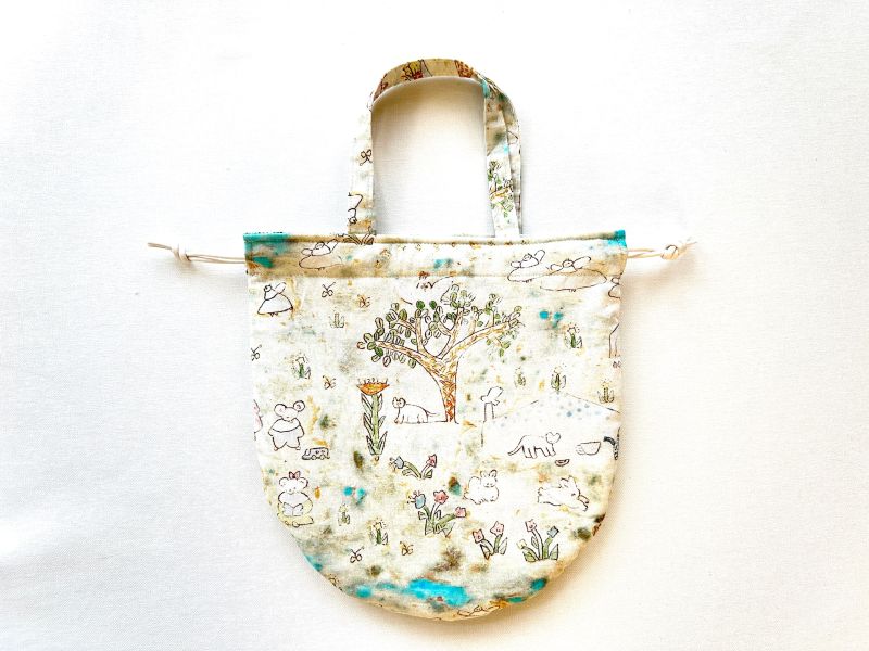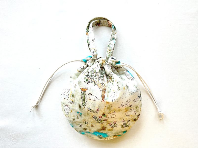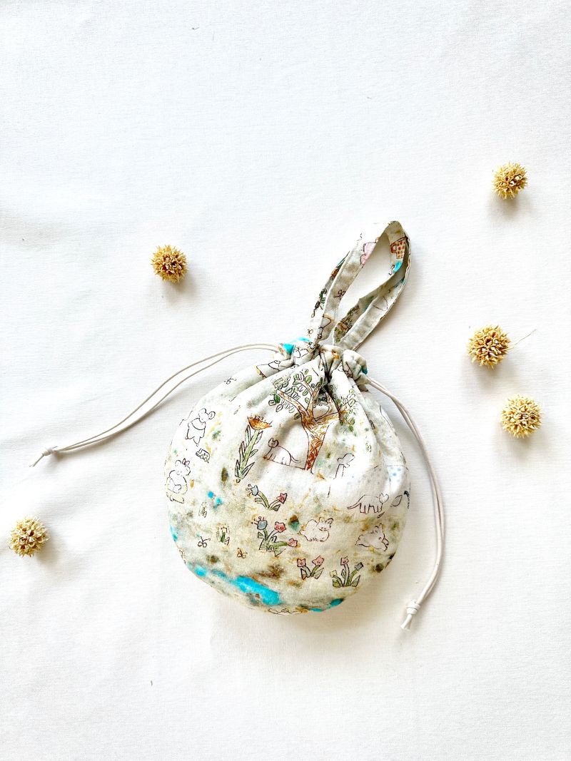 This small drawstring bag can hold all the items you want to carry with you, like your cellphone, glasses, and lip balm. It’s handy to use as a bag-in-bag when you’re out and about. The fabric used for this bag is a textile designed by the pottery artist, Mishakosha. The design features cute illustrations of flowers, butterflies, and ceramics, reminiscent of a scene from a fairy tale. Being slightly thin cotton sheeting, this fabric is ideal for making bags, pouches, and other small items.