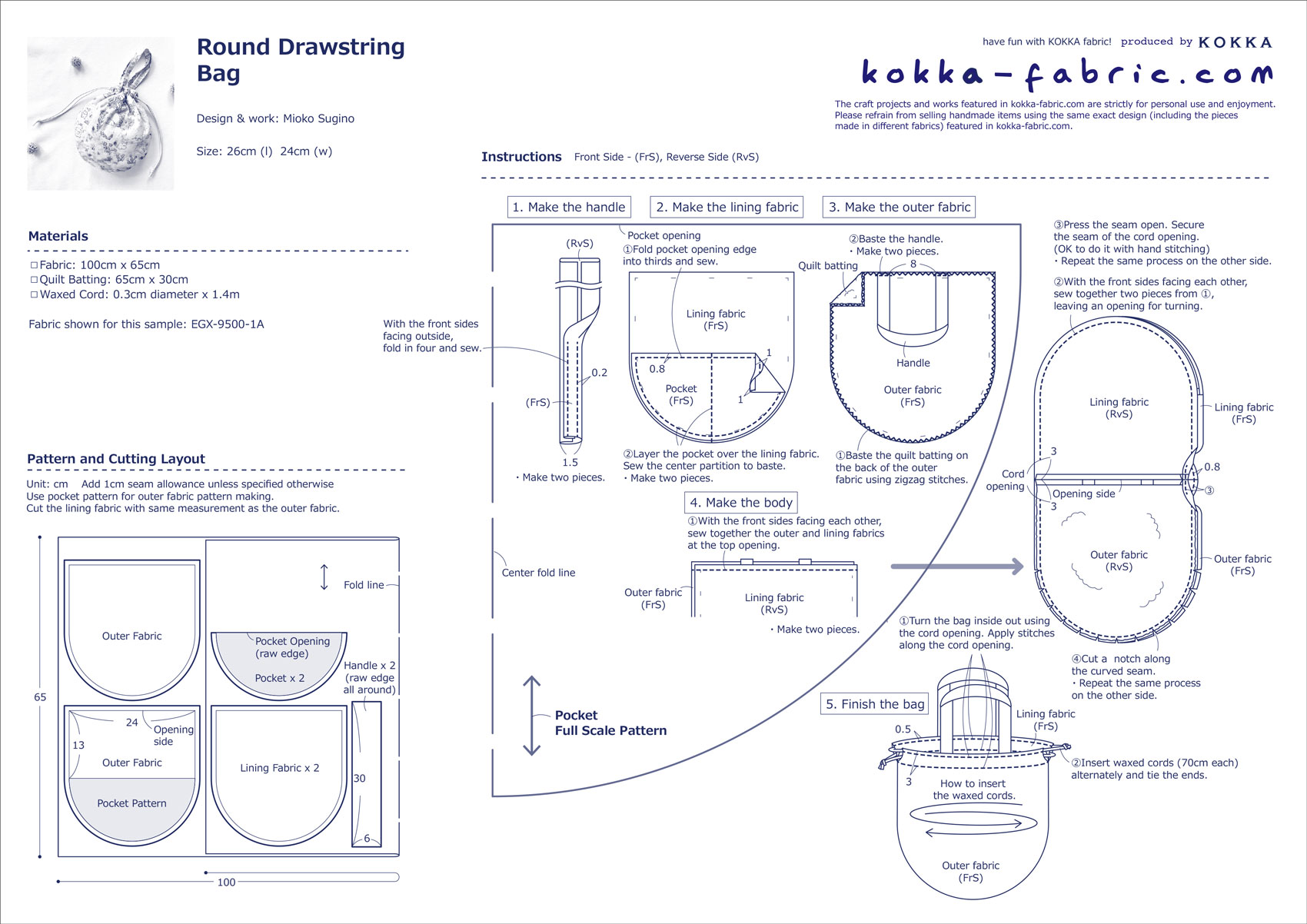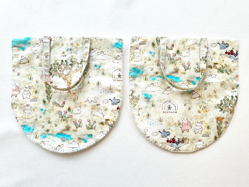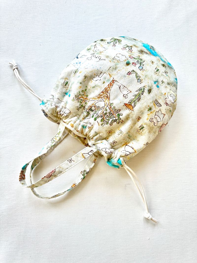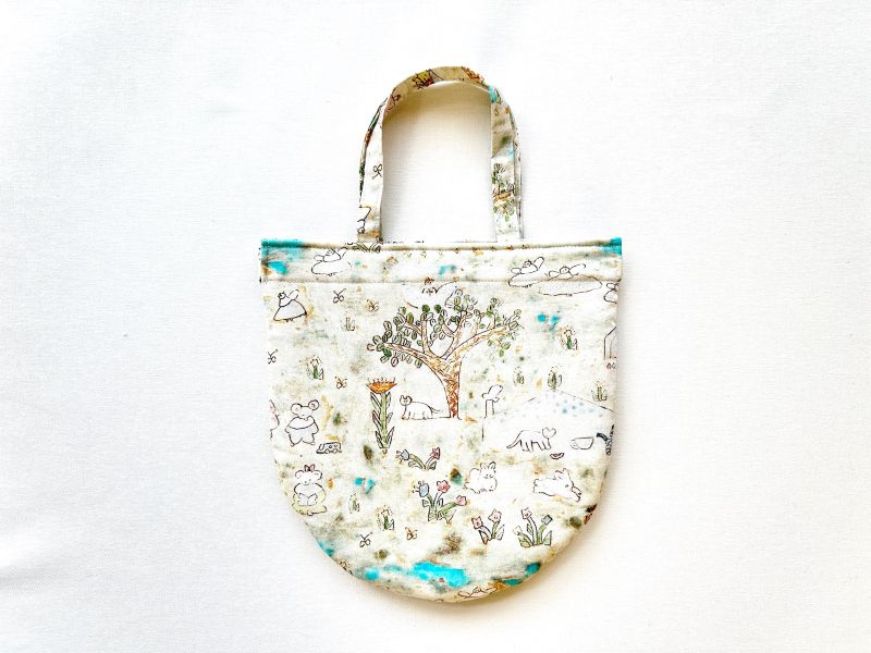 This small drawstring bag can hold all the items you want to carry with you, like your cellphone, glasses, and lip balm. It’s handy to use as a bag-in-bag when you’re out and about. The fabric used for this bag is a textile designed by the pottery artist, Mishakosha. The design features cute illustrations of flowers, butterflies, and ceramics, reminiscent of a scene from a fairy tale. Being slightly thin cotton sheeting, this fabric is ideal for making bags, pouches, and other small items.