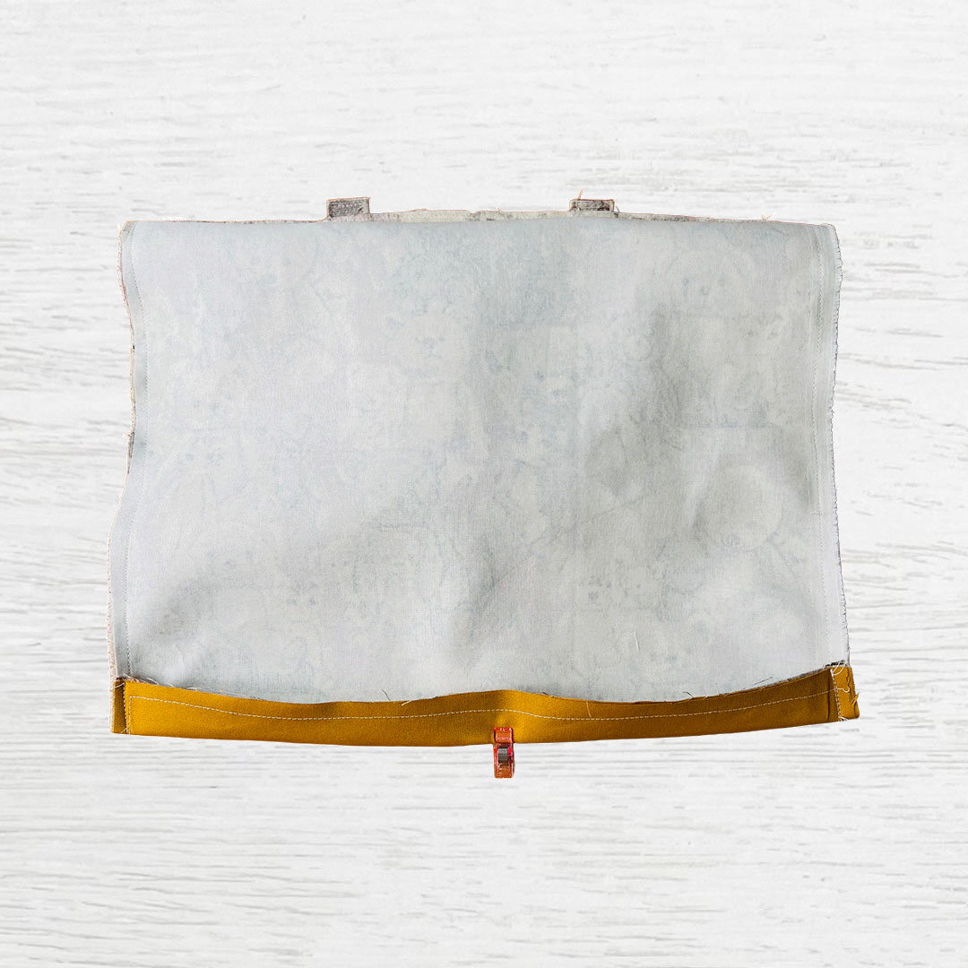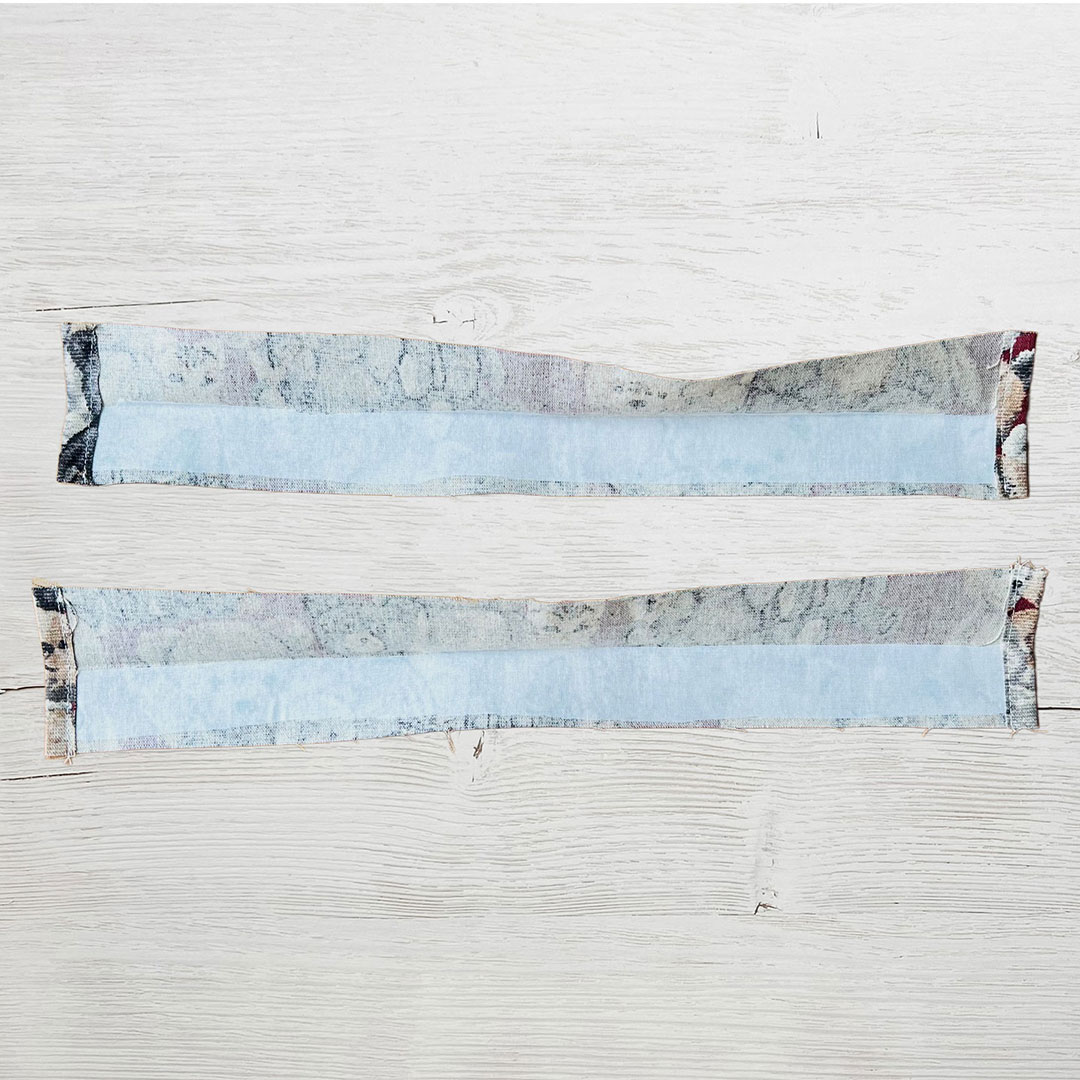 Adhere fusible interfacing on the back of the opening fabric. Only place the interfacing on half the side of the lining where it will face the front. Fold both short ends by 1cm. -