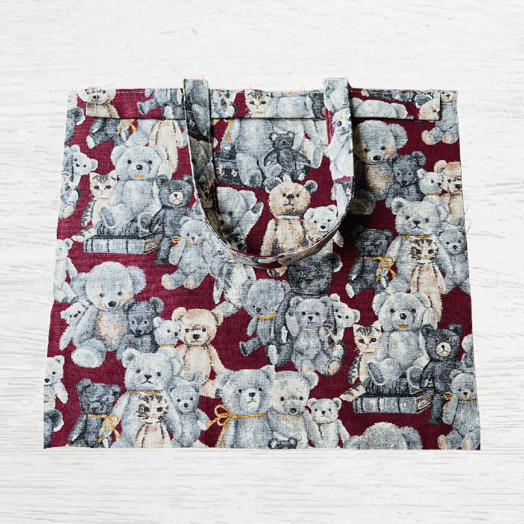 This tote bag features a gathered closure like a drawstring pouch. The fabric used for this bag highlights a classic teddy bear pattern in a Gobelin-style print. While it conveys the luxurious feel of a Gobelin weave, it's made from easy-to-sew cotton-linen canvas, making it ideal for bag making.