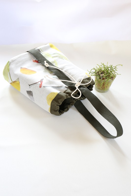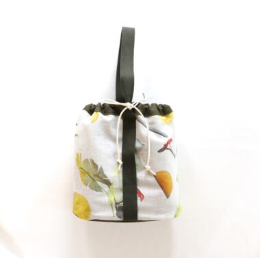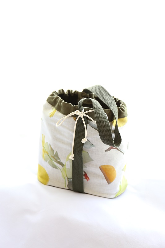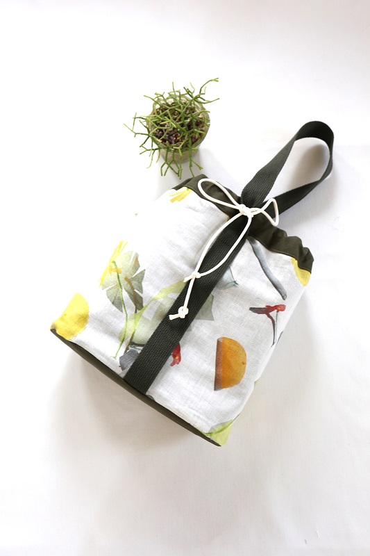 This is a well-constructed drawstring bag with #9.5 canvas for the lining. The featured fabric is [Tanpopo] from the “Homemade Utopia” series. The textile is inspired by the image of a gentle world full of handmade products, and the natural colors create a comfortable feeling.