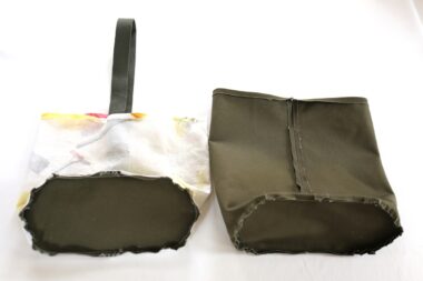Fold the top opening of the lining bag with 3cm width. Turn only the outer bag inside out. With the front sides facing outside, place the lining bag into the outer bag.