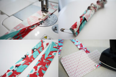 Make the handles. With the front sides facing each other, fold the long end in half and sew the edge. Press the seam open and turn it inside out. Fold the ends for 1cm.