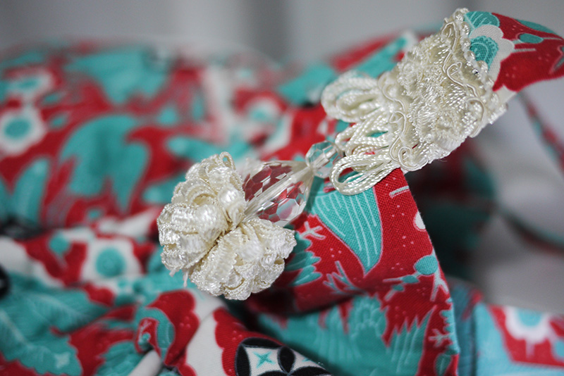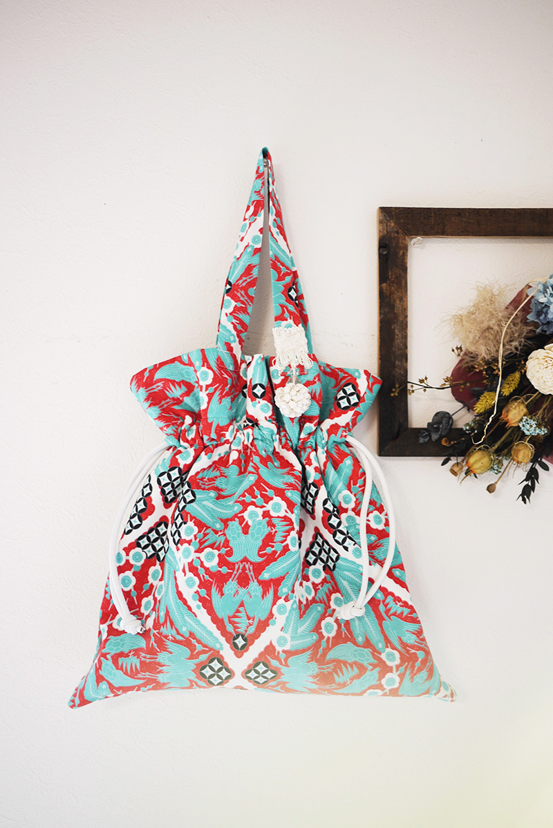 Gorgeous and stylish, it perfectly fits my taste. It was so much fun thinking about what to make with this fabric. The design features Japanese festive motifs of cranes and turtles, so I came up with a bag with drawstrings, which is inspired by a Japanese style.