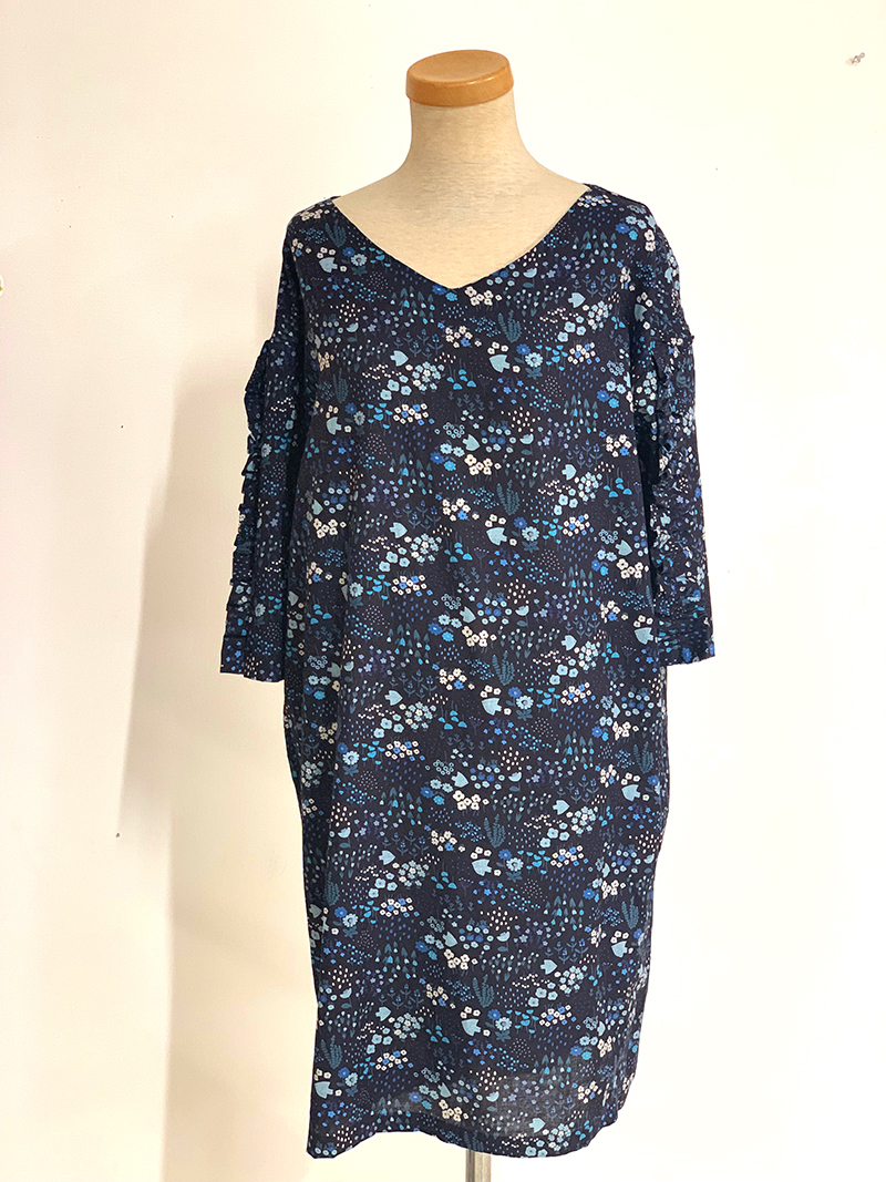This long one-piece dress is accented with frills on the sleeves. The stylish design also incorporates a gathering on the back body. The featured fabric with a flower field pattern is a 100% cotton poplin from the Hokkori Life series.