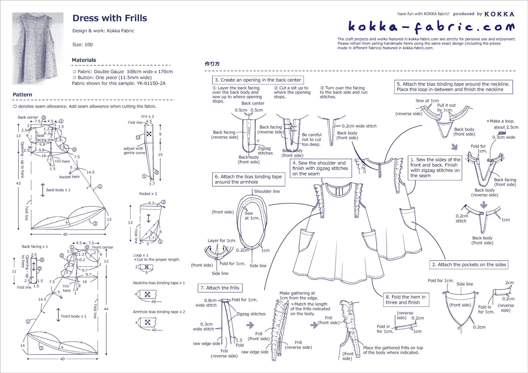 This kid’s dress is lovely with frills at the armholes and comes with convenient side pockets as a cute accent. The featured fabric is a cotton 100% double gauze from the SWEET ANIMAL series. The pattern is laid out in one direction, so when cutting the fabric, make sure to check the direction.