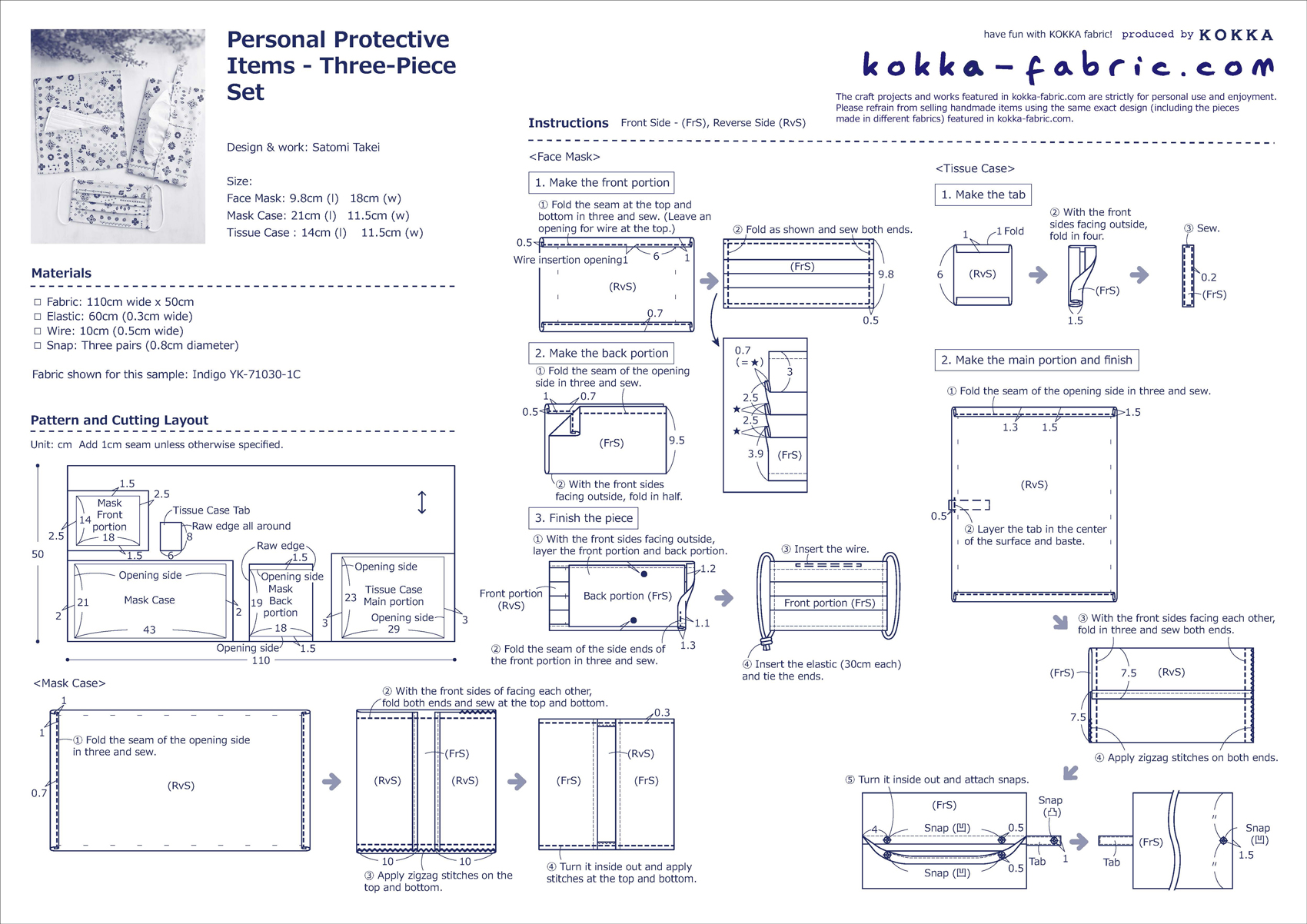The face mask has become an essential item for personal protection when going out. With only 50cm of 110cm-wide fabric, you can make a face mask along with a mask case and a tissue case. The tissue case, not specifically for a usual pocket tissue, allows you to conveniently carry folded box-size tissues. The smooth sheeting cotton 100% fabric from the Indigo series is a perfect fit for making these personal items. As all items are washable and dry quickly, you can always keep them safe and clean.