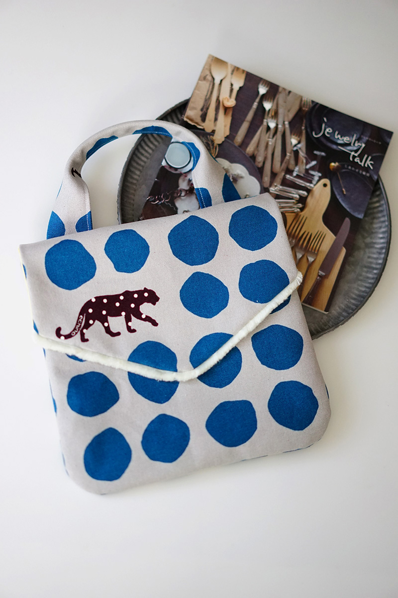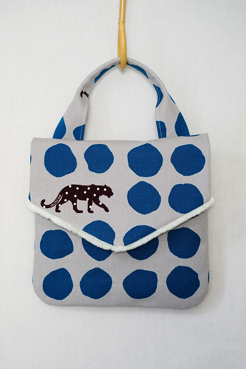 This pouch with a folded flap is accented with fringes made from the fabric edge. The fabric used for this pouch is “Panther,” a popular design from the long-time favorite “echino.” Even with its slight thickness, it is an easy to sew #9.5 canvas fabric.
