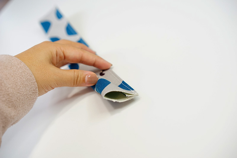 Make the handle. Fold the edges of the long end by 1cm. Then fold in half and sew along the edges.