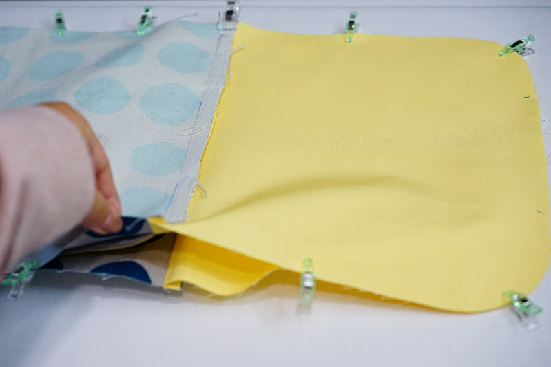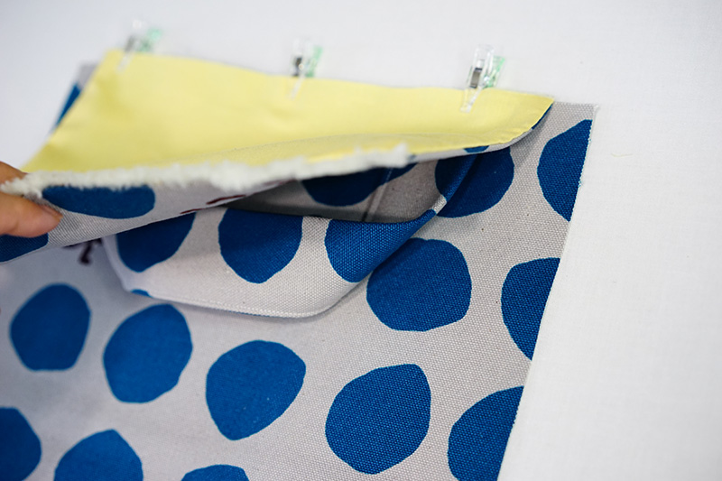 Put together the lining fabric and piece from step 6, and sew the opening side (with the front sides facing each other.) Repeat the process for the front side of the bag body. With the front sides facing each other, sew together the pieces at the opening.