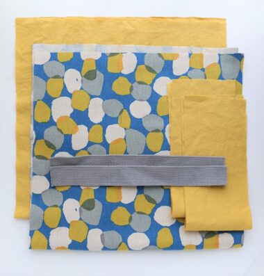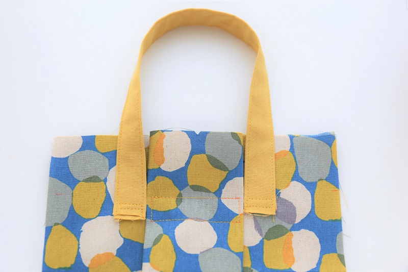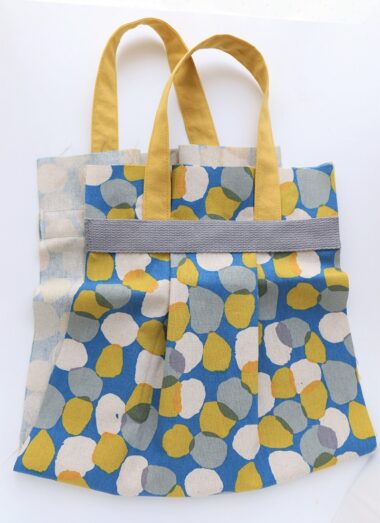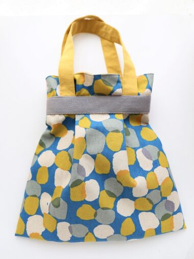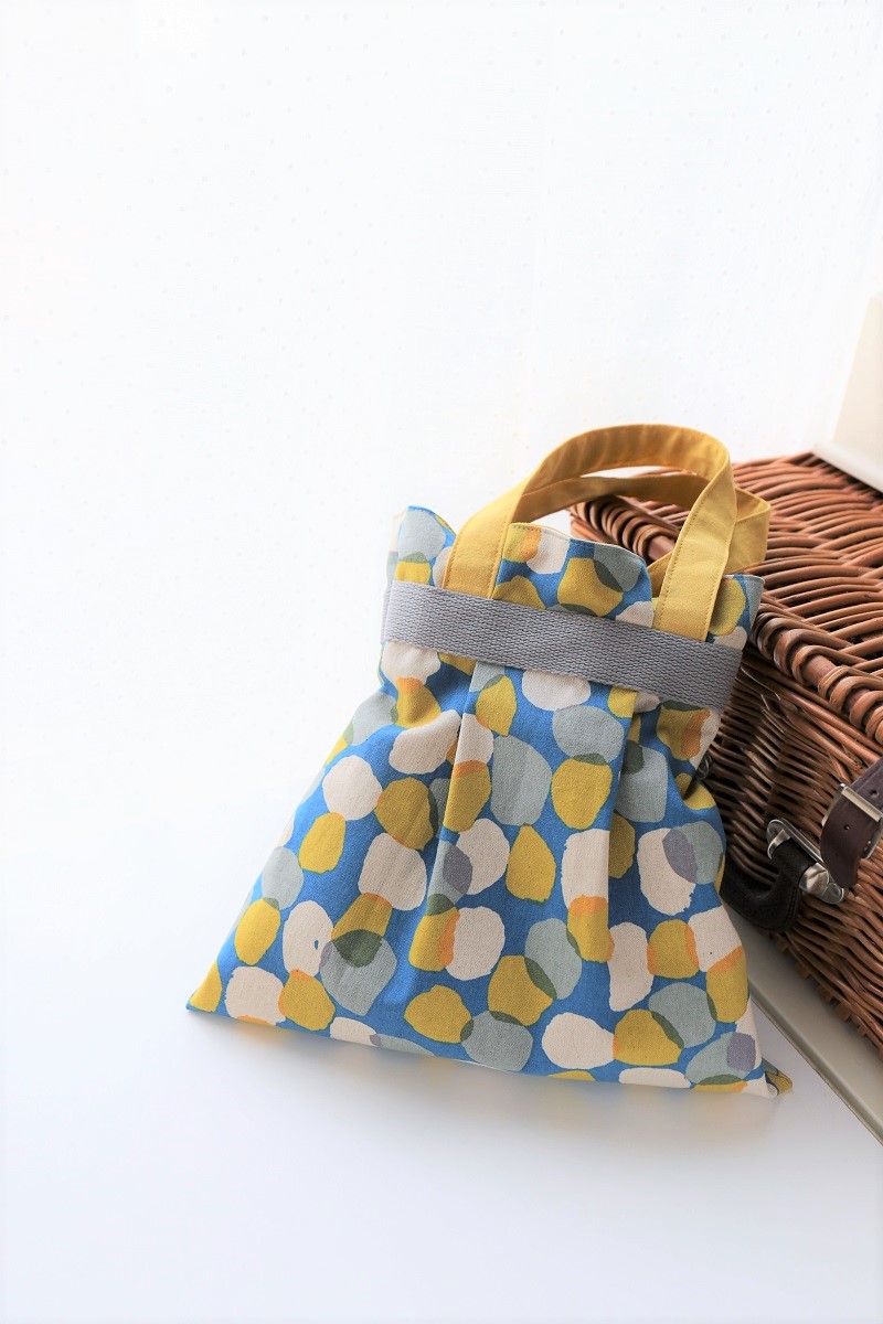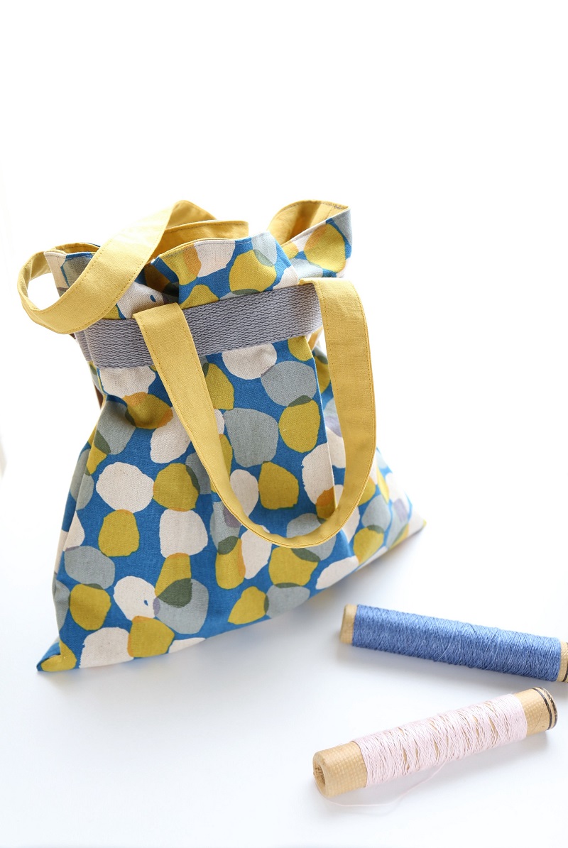 This small tote bag has a fluffy look with tightly shaped top. The tucks at the opening and tape are the secret to its cute look. The cotton linen canvas fabric with dot design from the egg press series is perfect for bag making. From Oregon, USA, the Portland-based egg press is a design studio/letter press printing workshop.