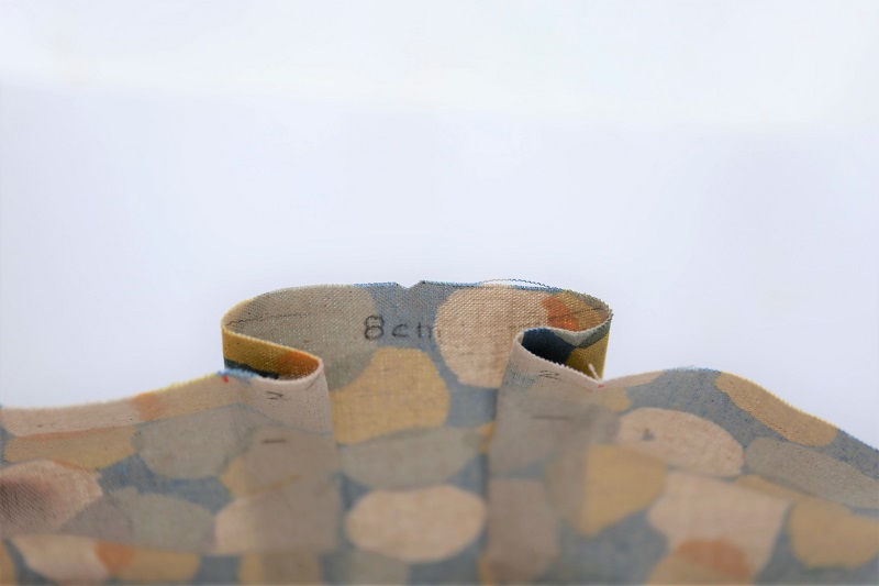 It is really cute with odd shaped dots in beautiful layer of colors! What makes it stylish is the gradation of tones where the colors overlap. Carrying a piece made with this fabric will lift up your spirits. It is sturdy and solid to create a steady shape. Taking advantage of this character, I incorporated the tuck and fold lines in the design.