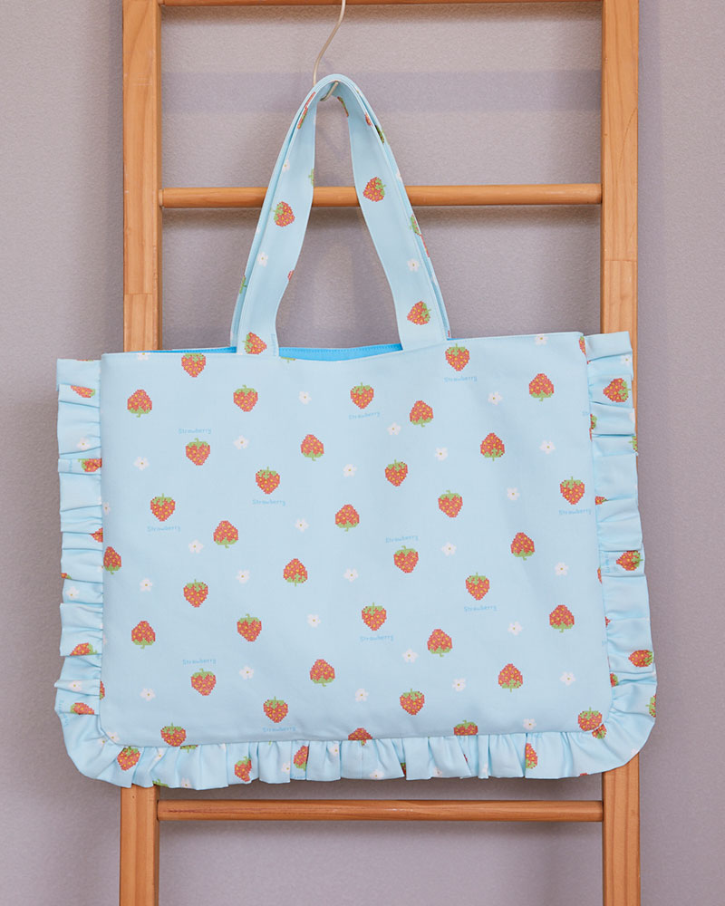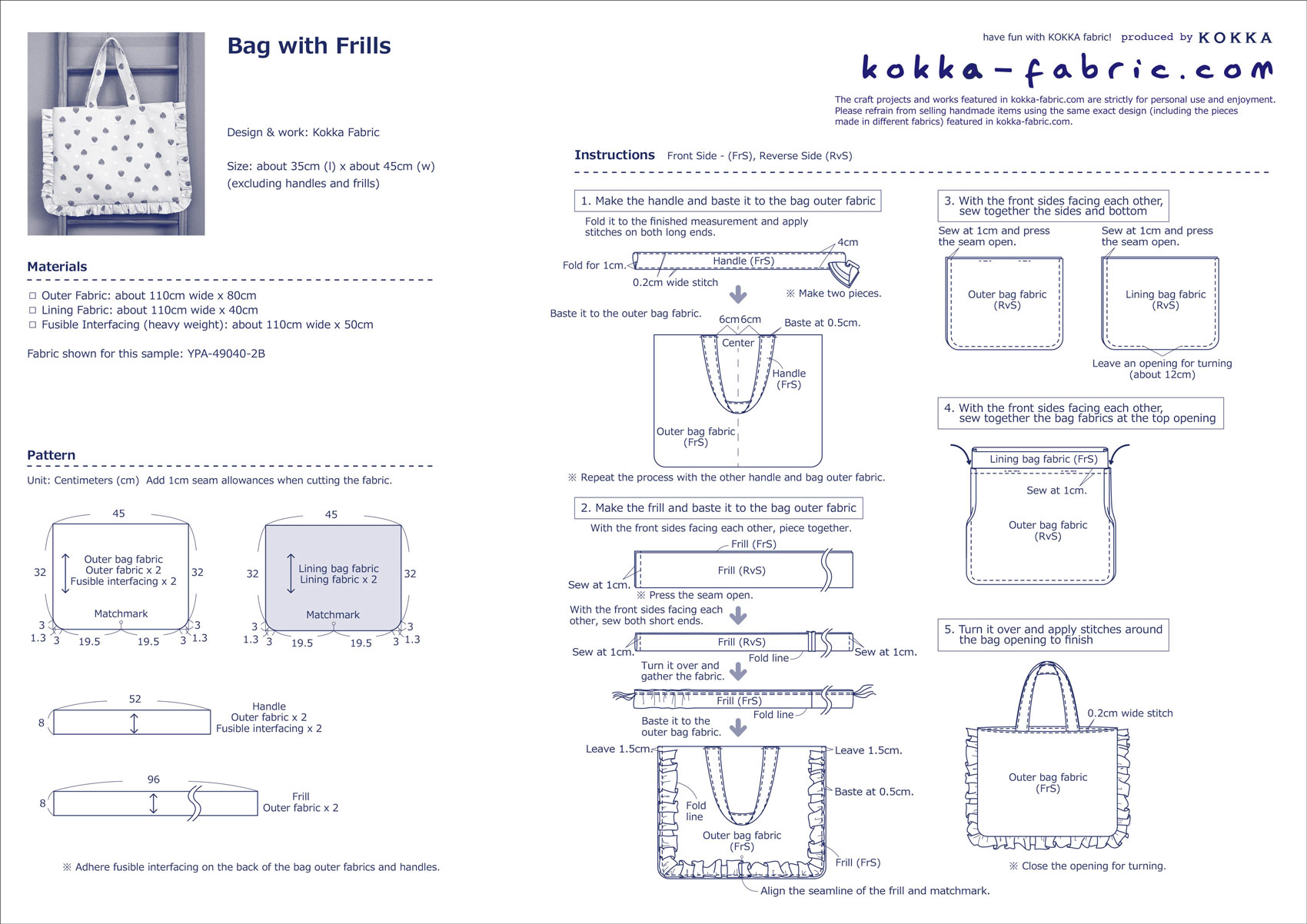 This lovely bag with frills around the side is perfect as a school or a lesson bag. The fabric used for this bag is from the “Petit embroidery” series. The 100% cotton oxford is easy to sew, making it suitable for sewing beginners.