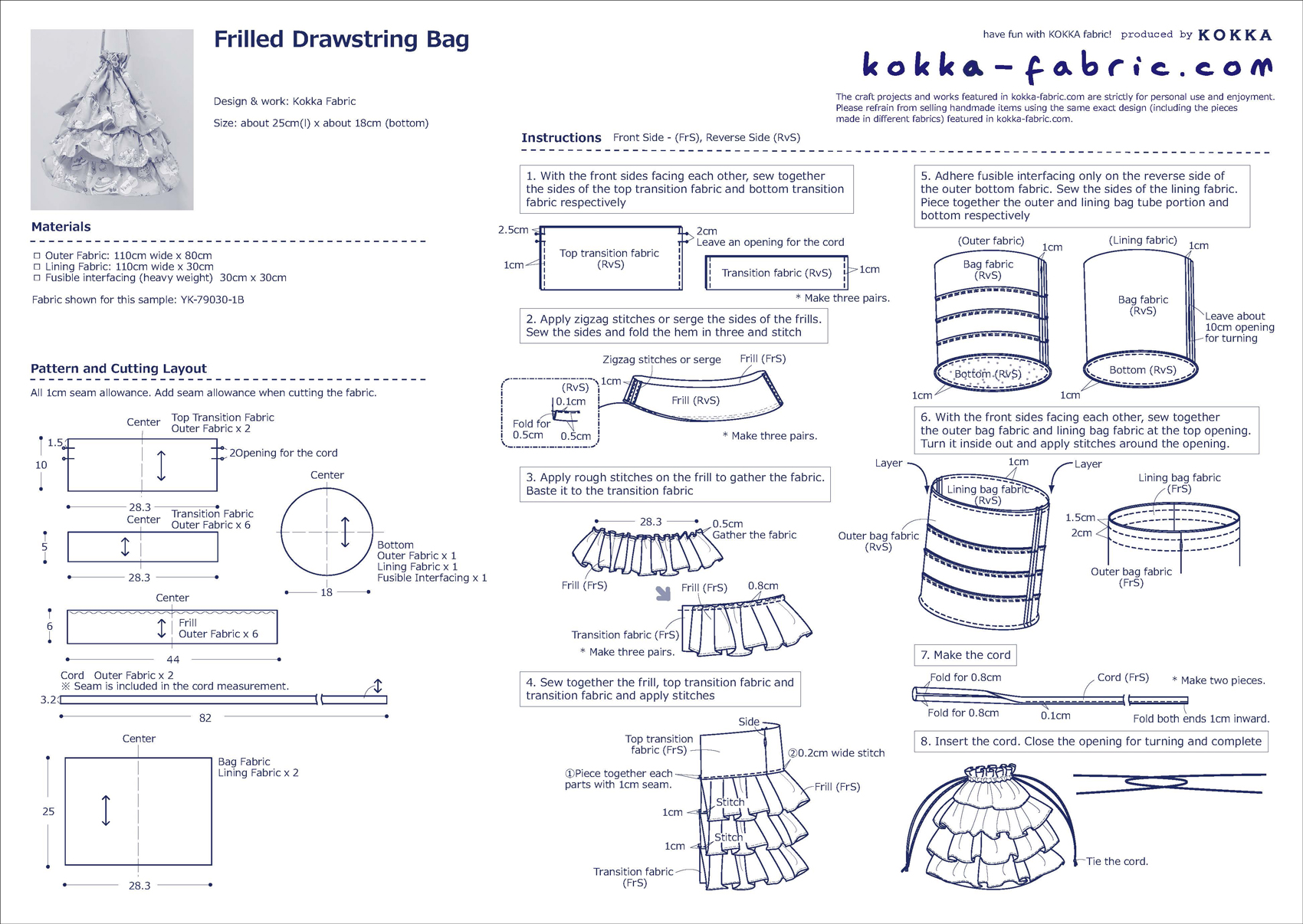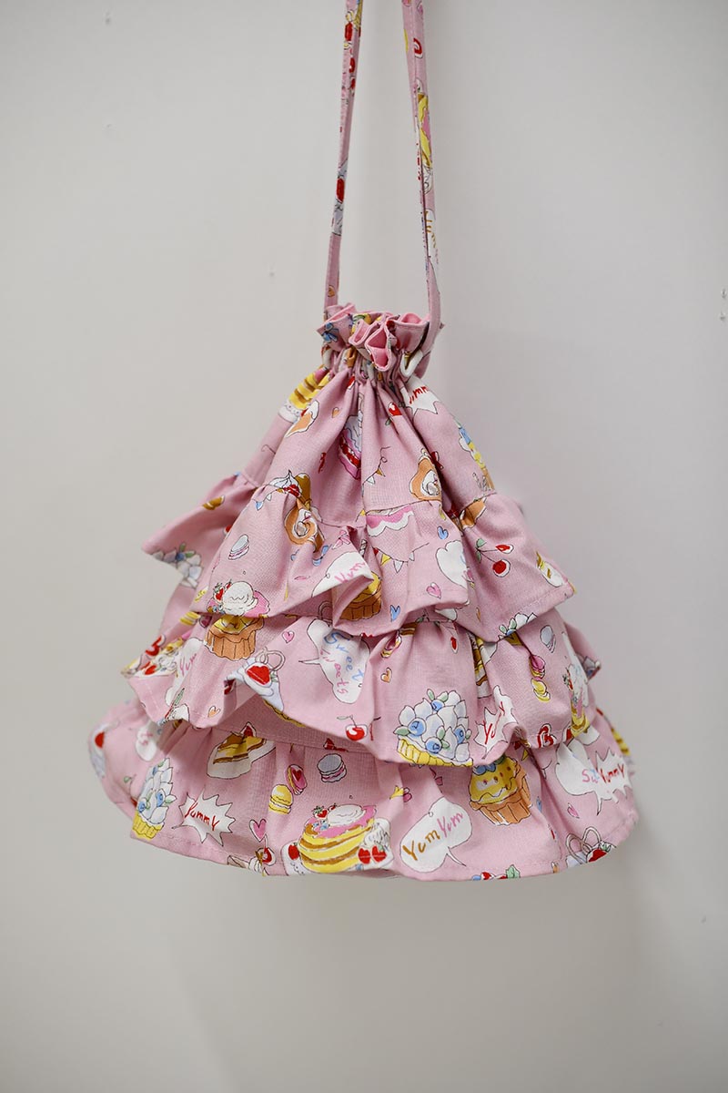 A lovely frilled drawstring bag comes with a round bottom, making it stable and perfect for carrying lunch boxes. When the top is tied, it turns into an adorable cone shape. The delicious looking sweets-filled fabric is from the “yummy fabric” series. 100% cotton sheeting.