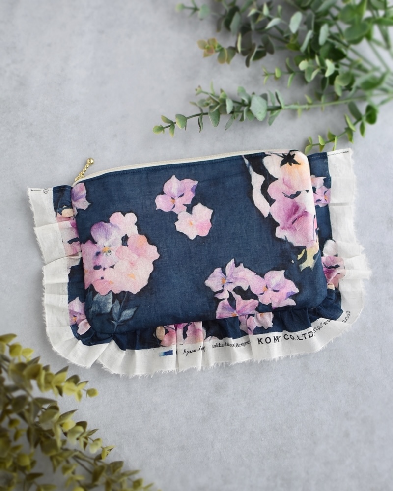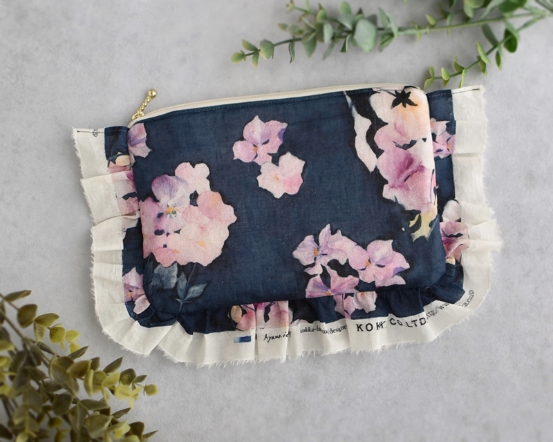 This versatile pouch can be used to store cosmetics, stationery, and other items. The fabric used for this pouch is “Viola,” a new pattern from Ayano Ichiyanagi’s textile series “yui.” The watercolor-like hues give it a soft impression, making it perfect for the season filled with gentle breezes. The thin cotton-linen blend fabric is slightly transparent, creating a light and airy fringe.