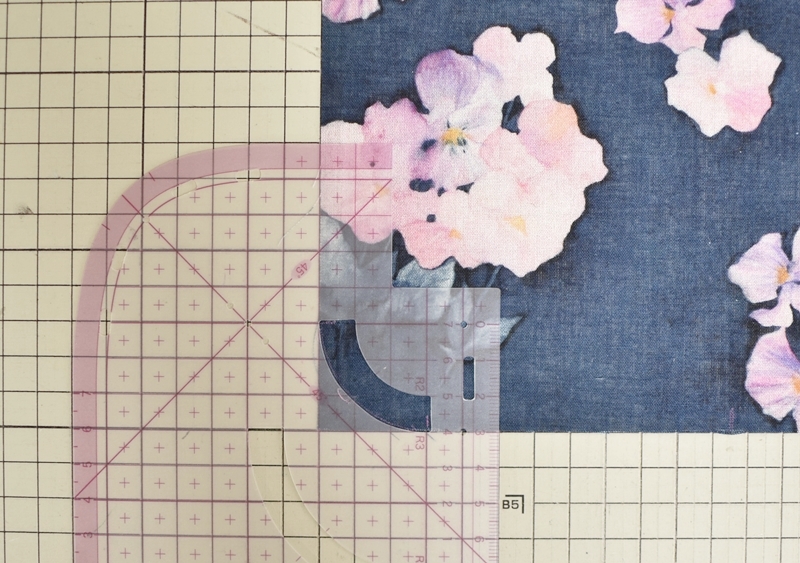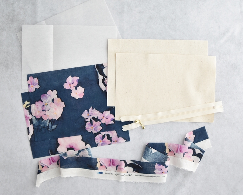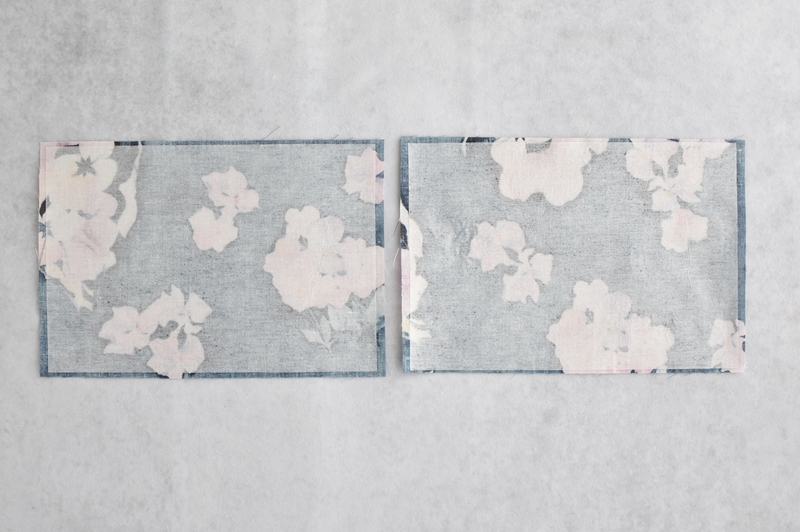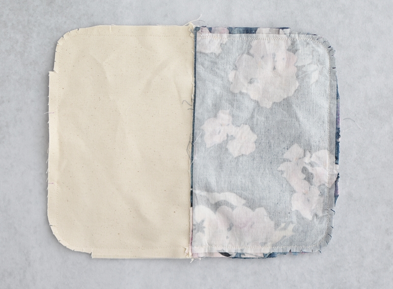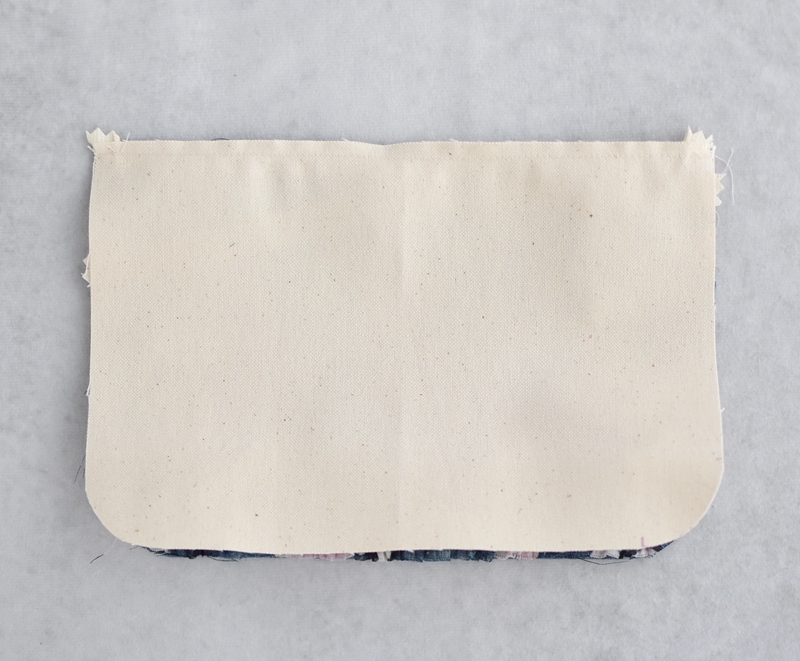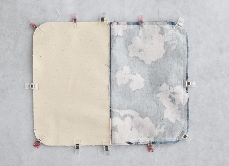 Adhere fusible interfacing on the back of the outer fabric. Cut the interfacing 5mm smaller than the size of the outer fabric. If using a thick outer fabric, the same size interfacing is acceptable.