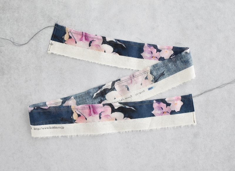 Fold both ends of the frill fabric by 5mm into thirds. Apply stitches at about 3mm from the edge.