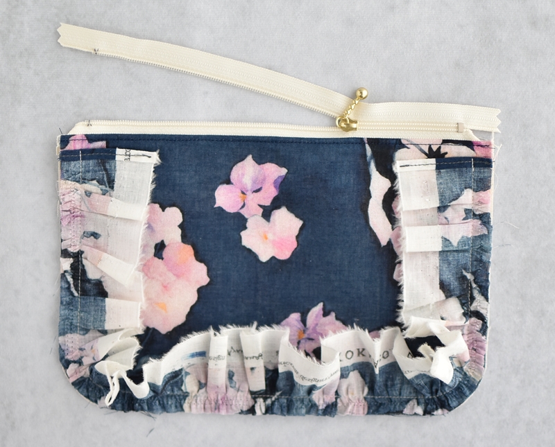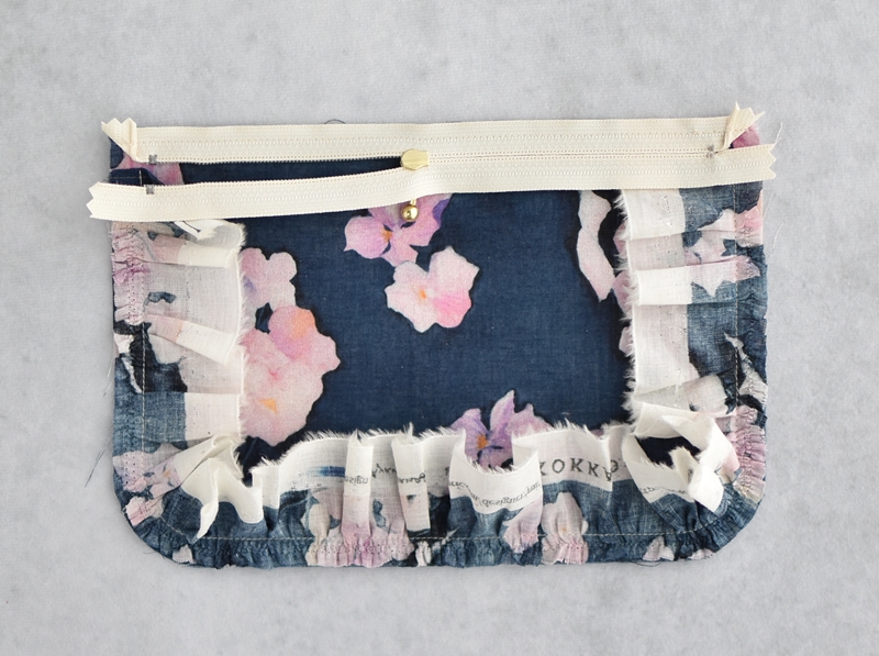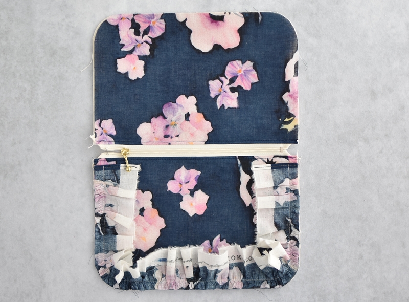 With the front sides facing each other, sew together the lining fabrics. Turn it over to the front side and apply top stitches along the zipper.