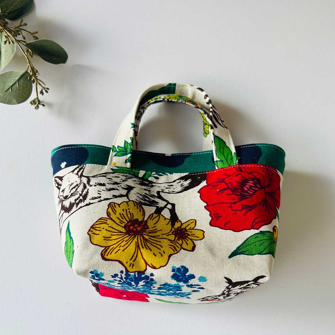 This is a drawstring bag adorned with ruffles on both sides. The fabric used for this bag is echino’s [and]. A 110cm-wide fabric features five different patterns including floral, stripes and geometrics. It is a sturdy cotton-linen blend, a perfect material for bag making.