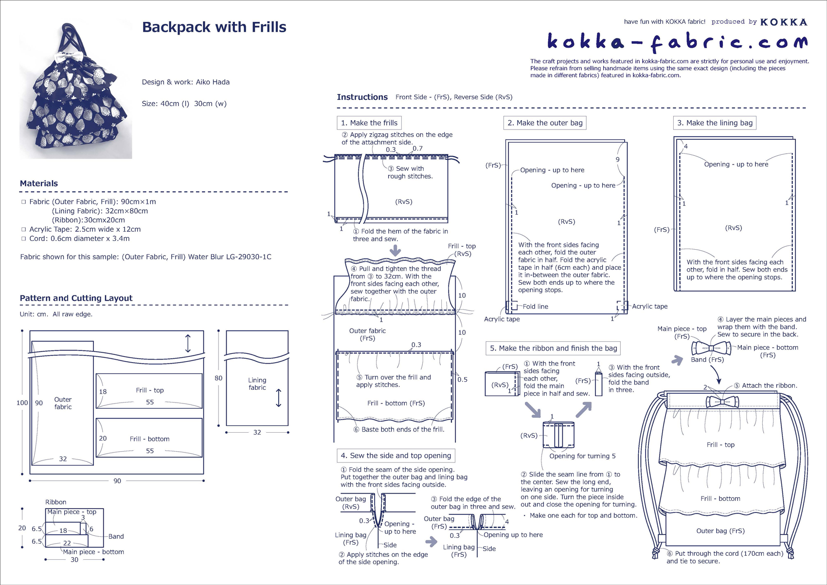 When you tighten the straps, this drawstring backpack creates a lovely shape like a frilled skirt. I paid attention to have a balanced look in both width and length. Imagining the finished look, entertaining different color combinations for the ribbon and strap was fun.
