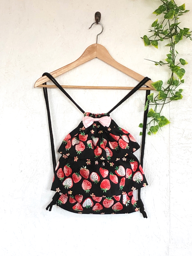 A very popular frilled backpack now comes as a drawstring backpack, perfect for school or everyday use! A lovely soft graphic strawberry print from the Water Blur series is featured. By adjusting the straps to be longer, kids can carry the bag over a Randoseru (Japanese style backpack), making it even more handy.