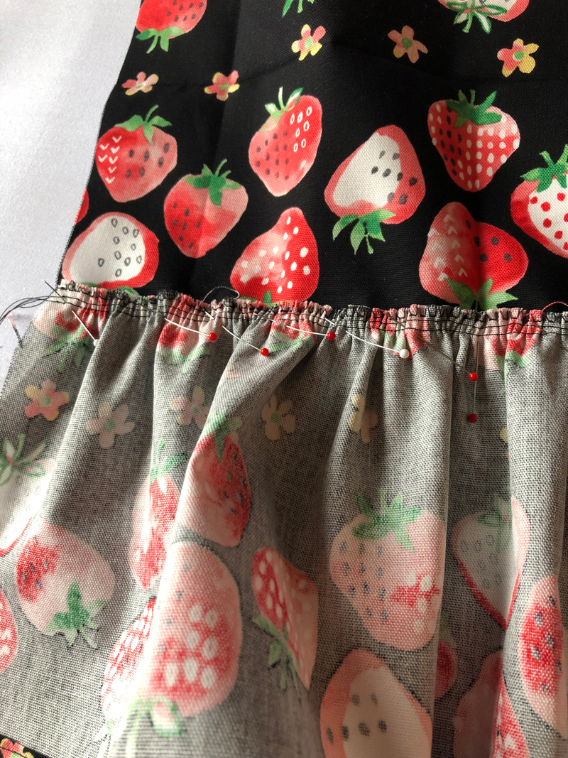When attaching the gathered piece, align the center and the bag fabric, then spread it little by little for a uniform look. If you are worried, baste it first for a clean finish.
