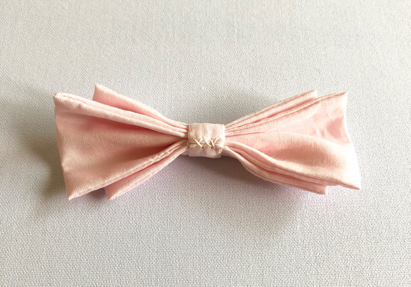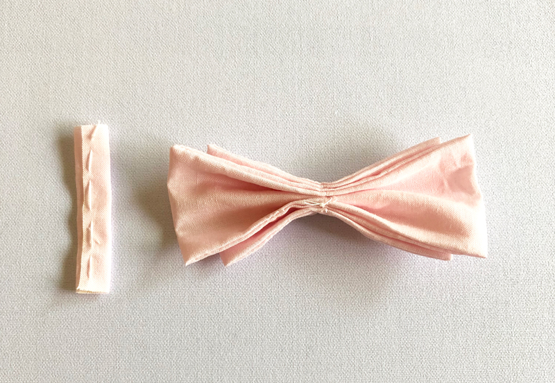 With the front sides facing outside, fold the center band piece in three. Wrap the ribbon with the band and sew to secure in the back. Picture shows the backside after the band is sewn.