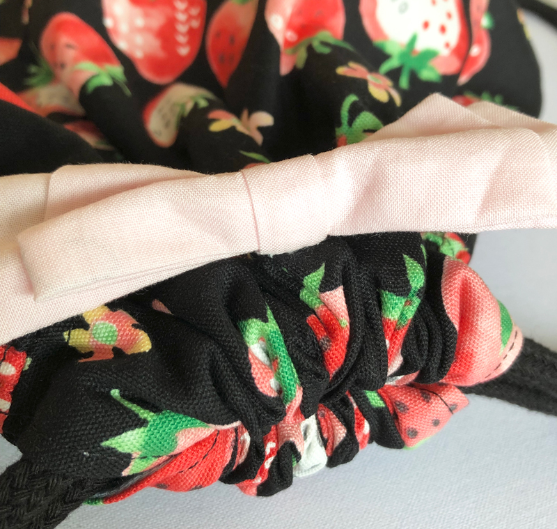 When you tighten the straps, this drawstring backpack creates a lovely shape like a frilled skirt. I paid attention to have a balanced look in both width and length. Imagining the finished look, entertaining different color combinations for the ribbon and strap was fun.