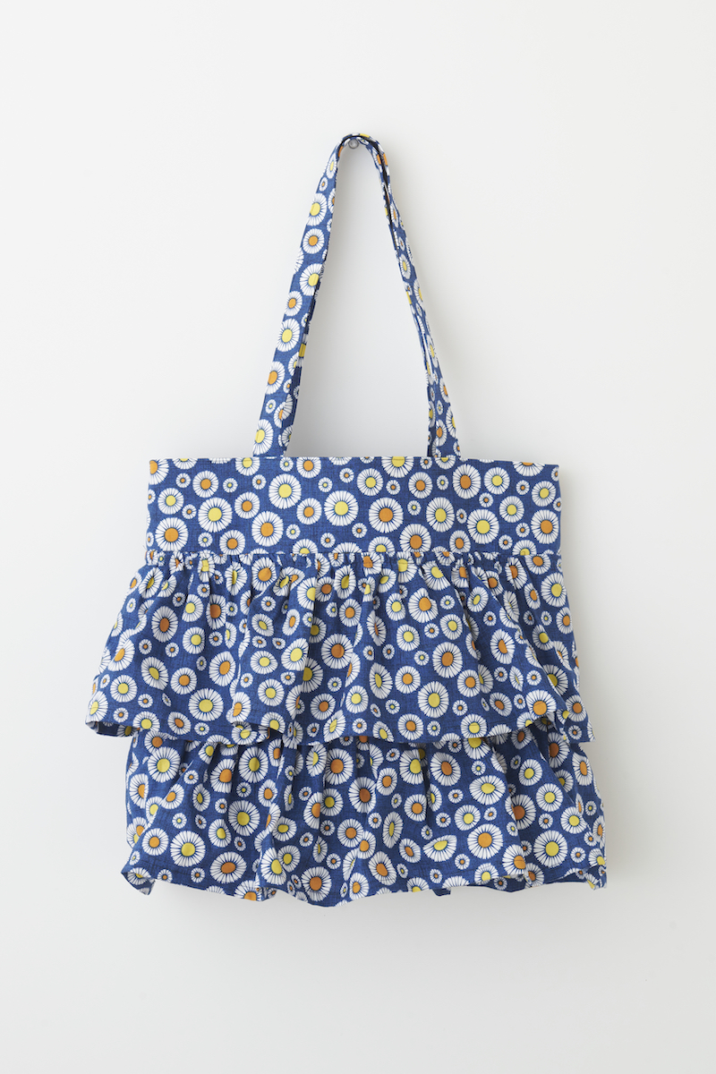 This is a lovely tote bag with two-tiered ruffles. The featured fabric is from the “Modan Pop Flower” series. It is sprinkled with large and small flower motifs that look like the sun or sunflowers. The 100% cotton sheeting is easy to sew and perfect for sewing beginners.