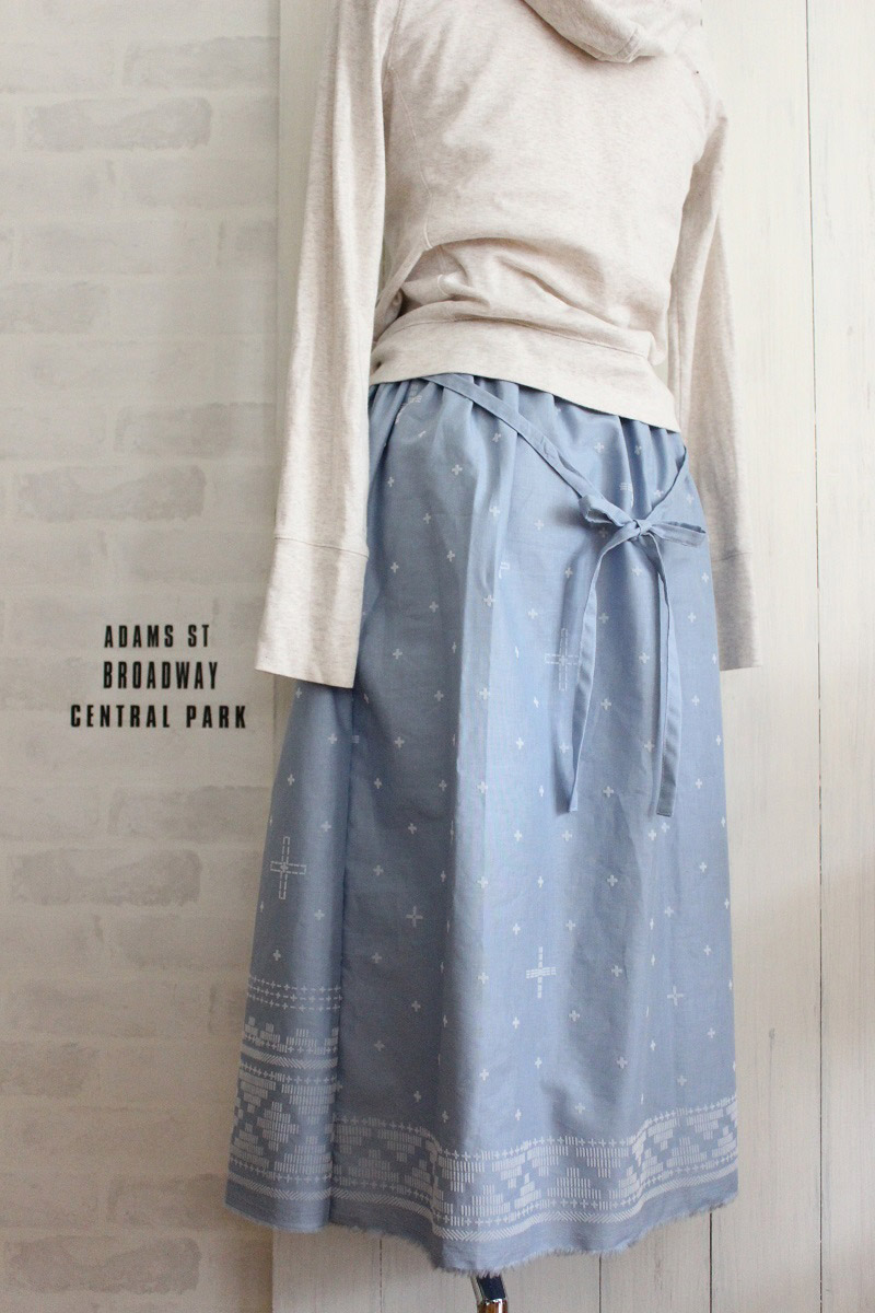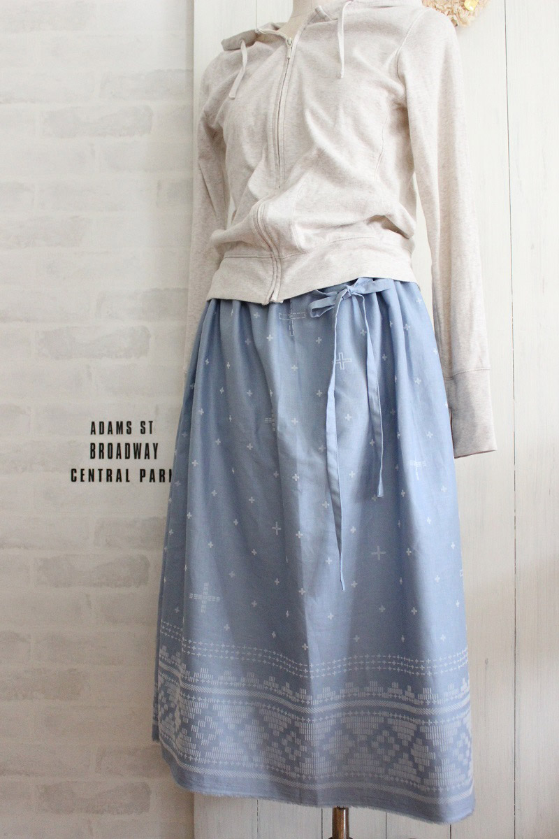 Featuring two different designs on both sides, it has the feel of a wraparound skirt, with an addition of ribbon to create a high-end look. The finished design allows you to enjoy the skirt in different positions with ribbons on the side, front or on the back. The color of the skirt may be too light for the fall/winter season, but it can be balanced by coordinating with deeper color leggings or stirrup pants underneath, looking stylish with ankle boots. For summer, it can be enjoyed cool and casually with a pair of sandals. It is a slightly translucent material, so you will want to put on something underneath.
