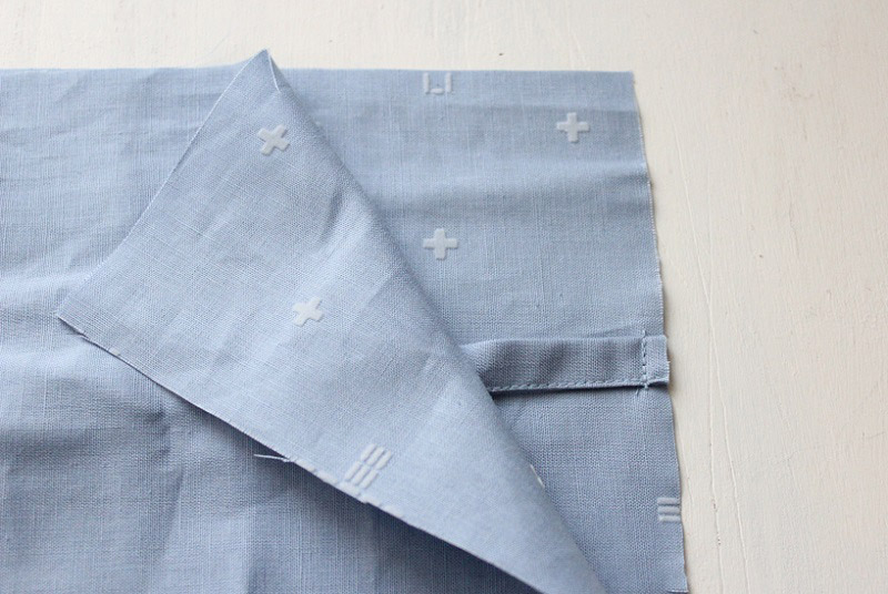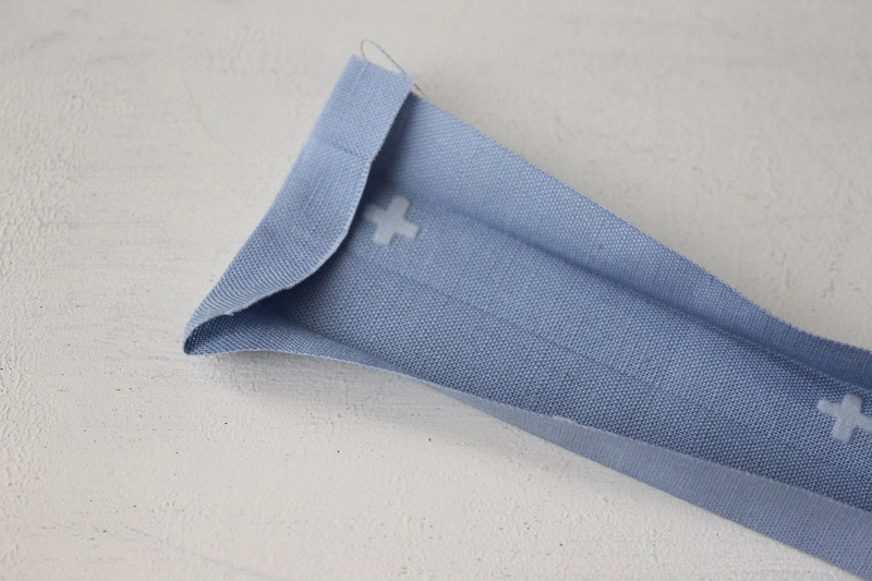 Fold the strap fabric in four, with the flocking surface facing each other. Fold one end as shown. Sew the edge to make two pieces of strap.