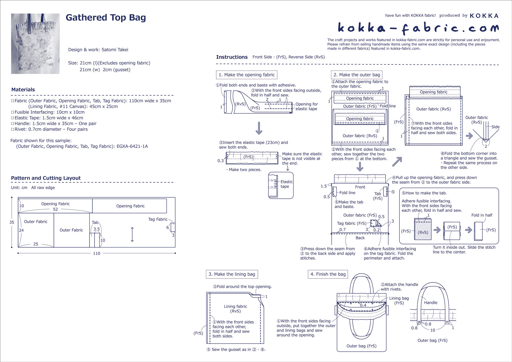 - Fabric (Outer Fabric, Opening Fabric, Tab, Tag Fabric): 110cm wide x 35cm