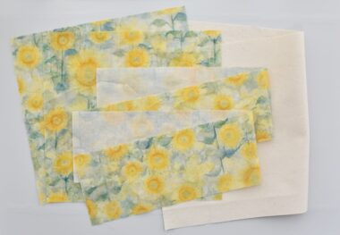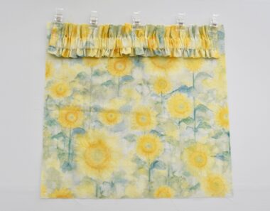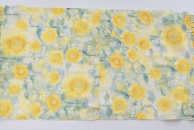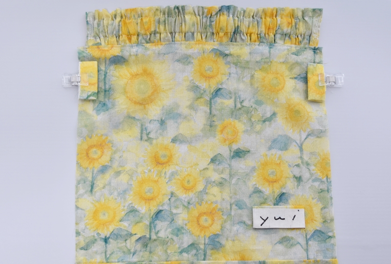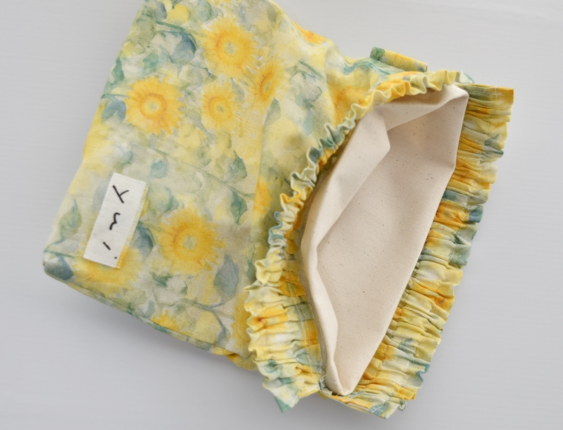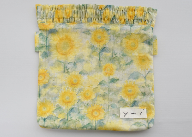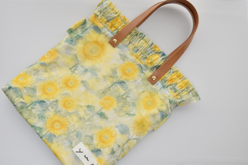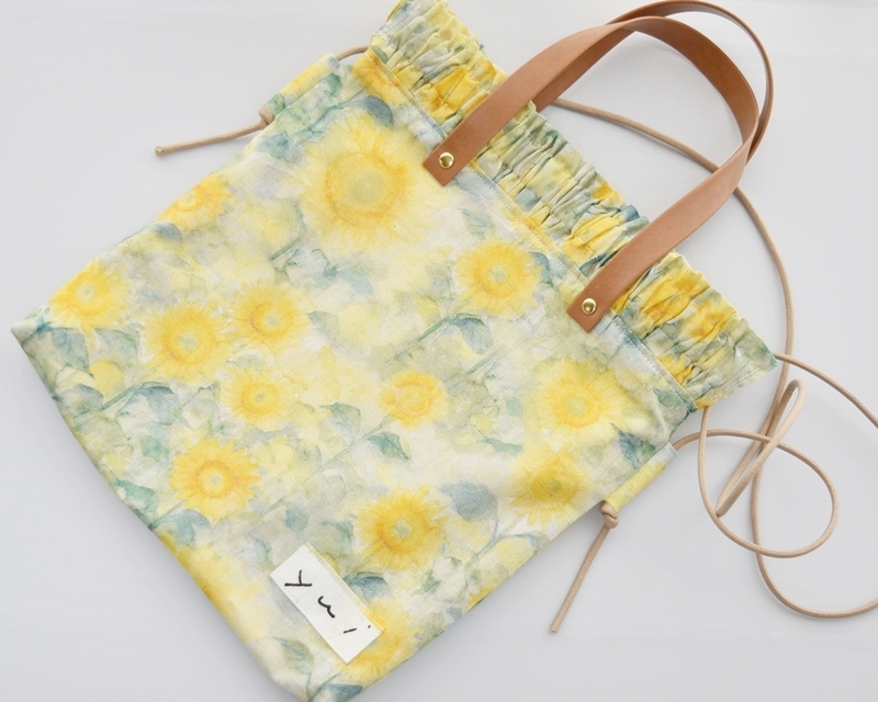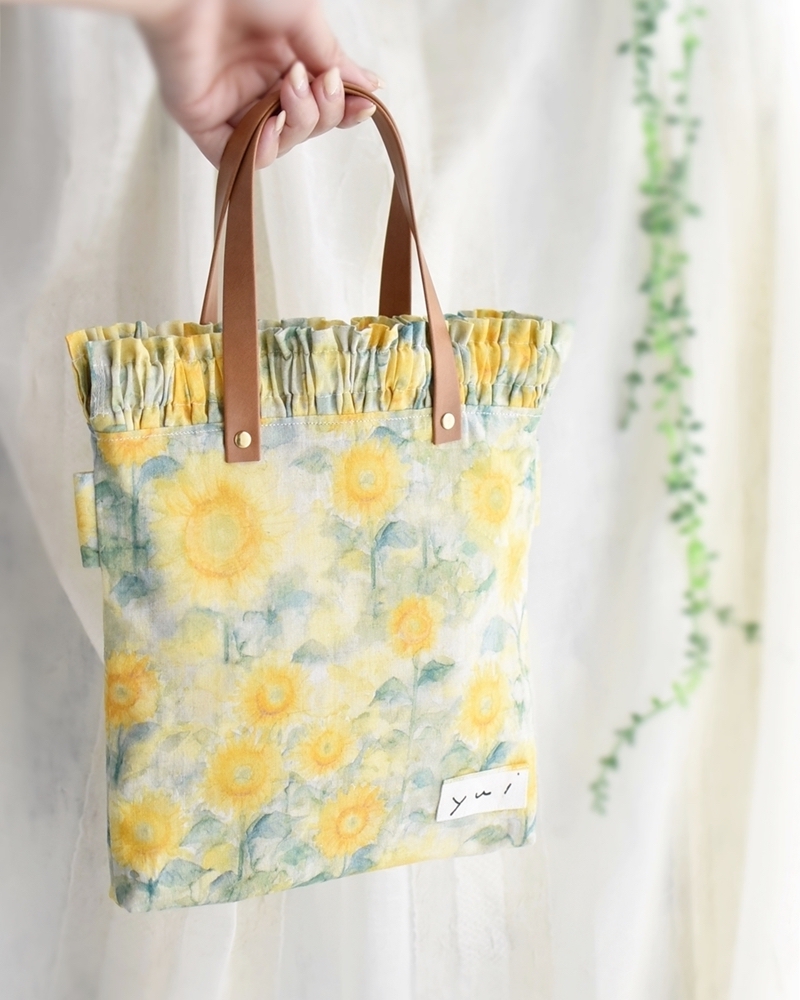 This stylish tote bag is accented with an ample gathering at the opening. The fabric used for this bag is a sunflower pattern [toujours] from the “Yui” series. It is a textile by Ayano Ichiyanagi, who creates watercolor paintings with nature as a motif. The vivid and warm yellow sunflowers are very impressive. Soft and thin cotton linen compass is perfect for summer fashion pieces such as blouses, dresses, and skirts as well as bags.