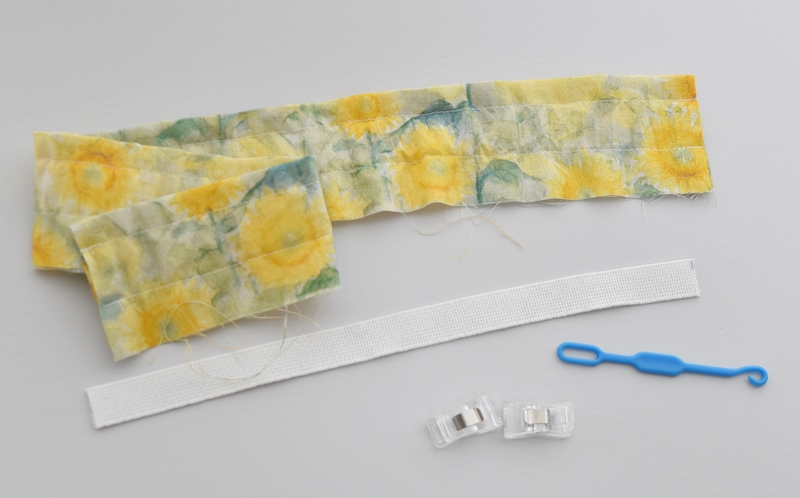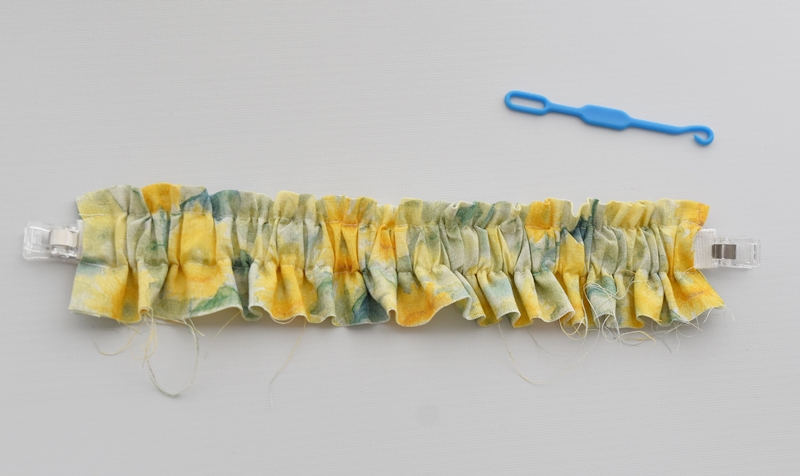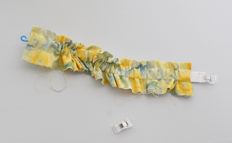 Place the flat elastic tape and gather the fabric. Secure the ends of the tape with a clip. Cover the elastic slightly and apply stitches from the front side to secure the elastic.