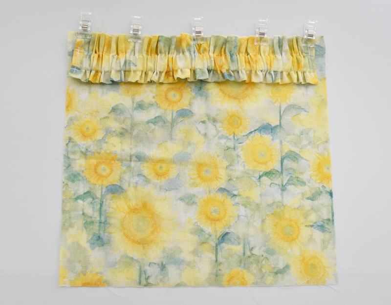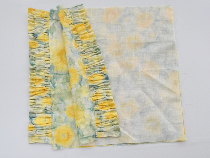 With the front sides facing each other, sew together the body and gathered fabric. Repeat the same process for the other side.