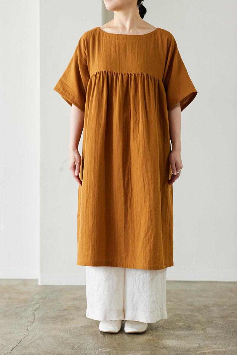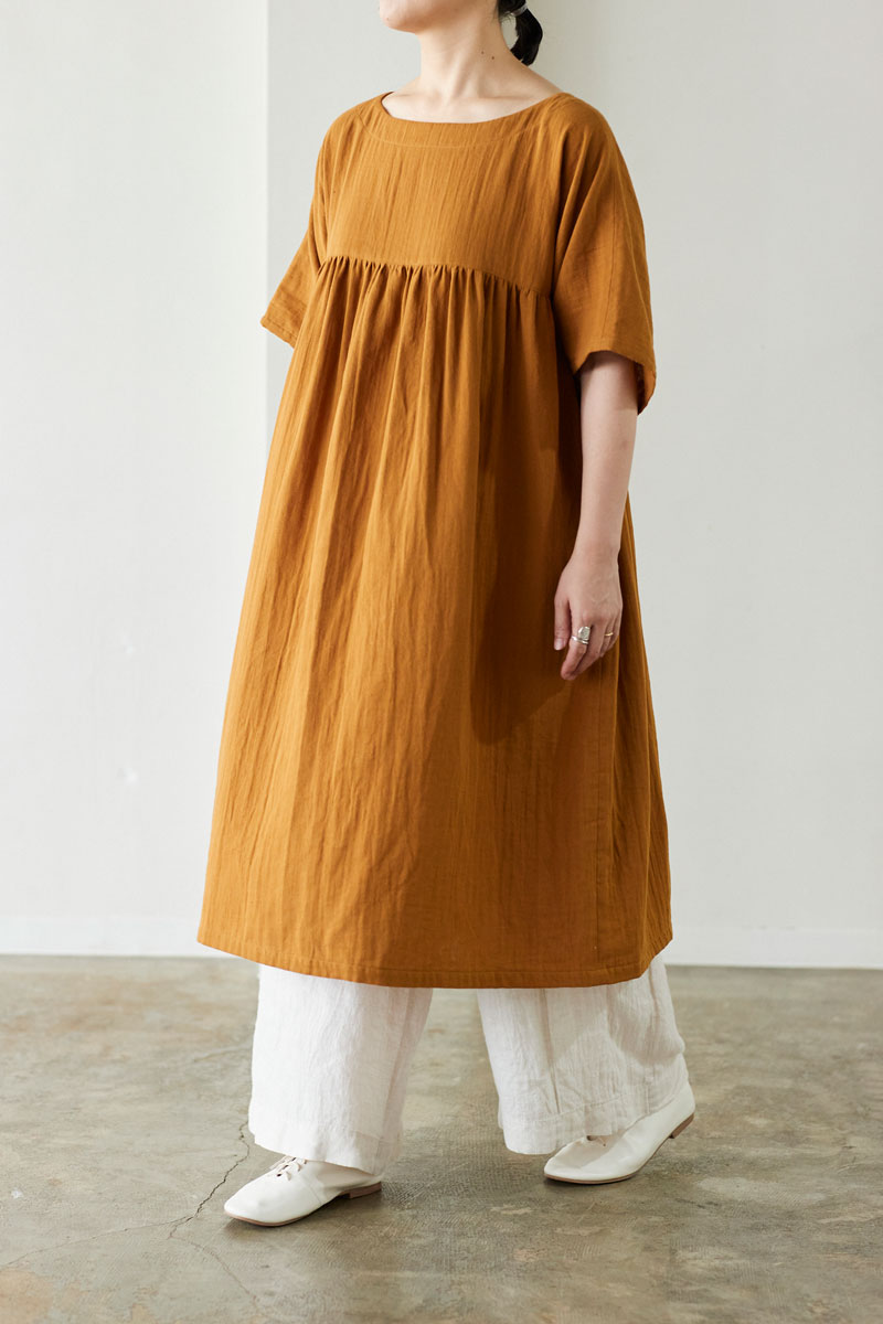 This dress with a gathered accent around the chest features a plain double gauze. The triple washed fabric is characterized by its soft, fluffy texture. Being 100% cotton, it is not only smooth, but also has excellent absorbency. You will love its light and feathery feel.