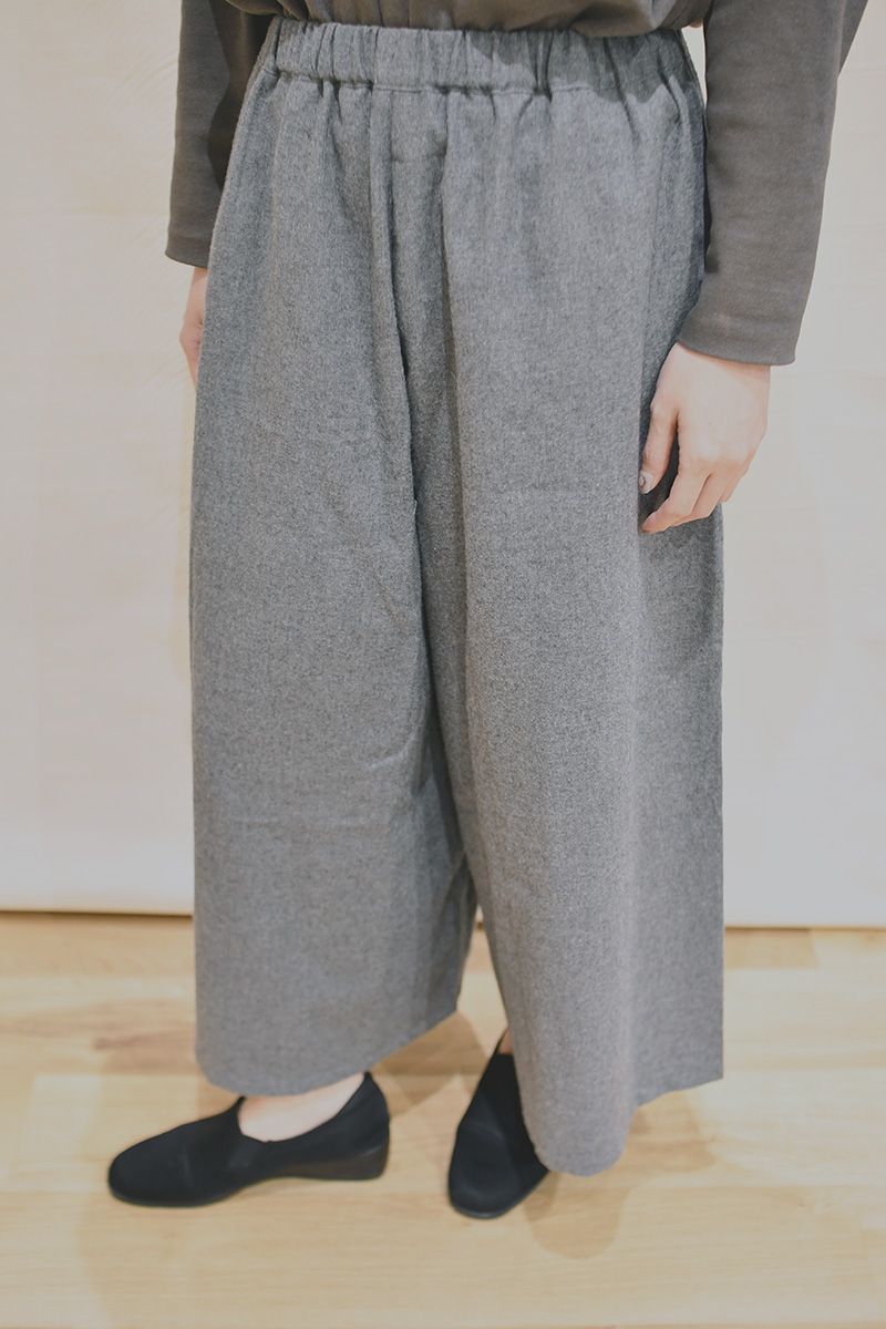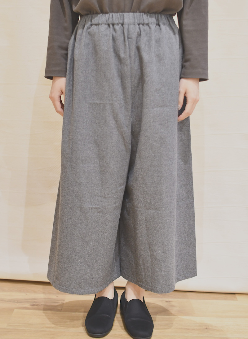 These gaucho pants have a loose-fitting silhouette. The fabric used for these pants is from the “NUNO TO MONO” series. It is a slightly lightweight, soft, brushed Viyella fabric with warm feel. It is very soft to the touch, making it suitable for pants, but also dresses, shirts, skirts, and other clothing.