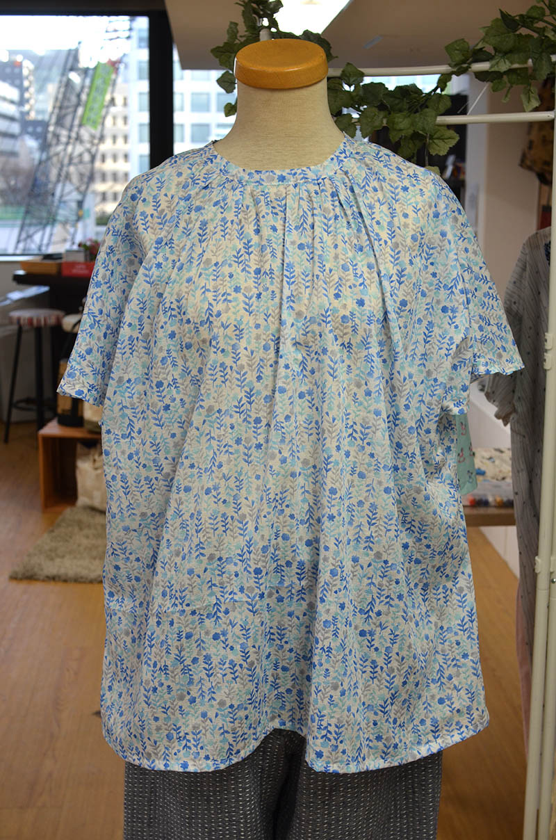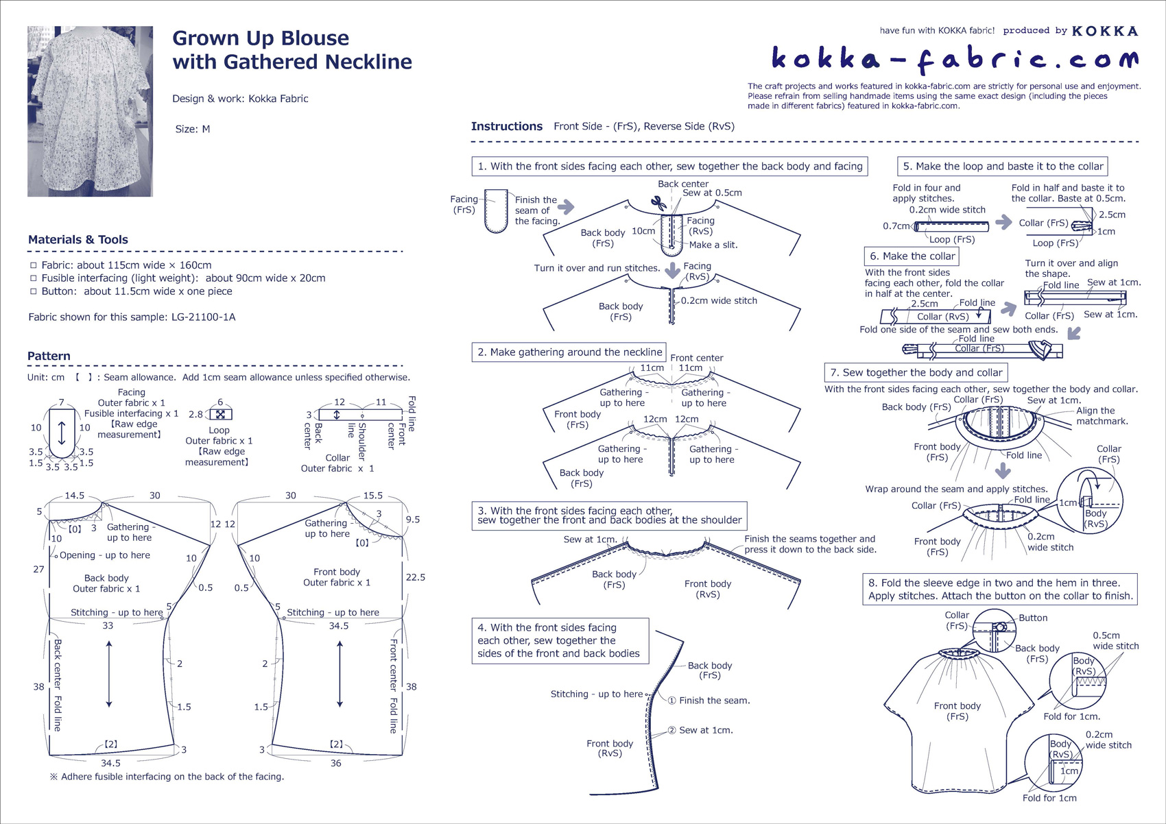 The showcased project is a soft style blouse with a gathered neckline. The button in the back creates a clean-looking silhouette. Cotton 100% single gauze fabric from the Comfort Gauze features a refreshing small blue flower design, a perfect match for the upcoming season.