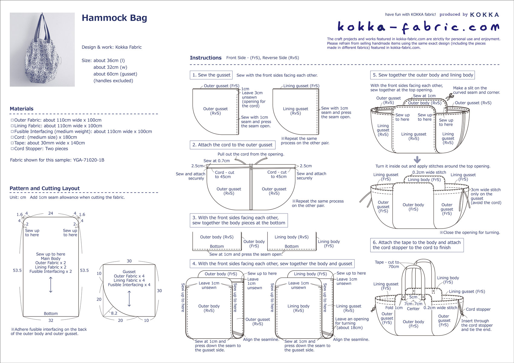 - Lining Fabric: about 110cm wide x 100cm
