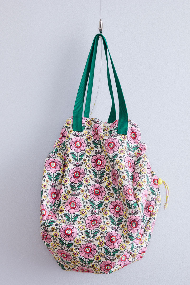 This hammock bag has a cute almond-shaped form. The wide opening makes it easy to carry your belongings; a perfect piece to be used as a diaper bag. It is also nice that the bag can be made compact with a string closure. The fabric used for this bag is a floral pattern from the “JAMBO” series in African-inspired colors. It is 100% cotton oxford.