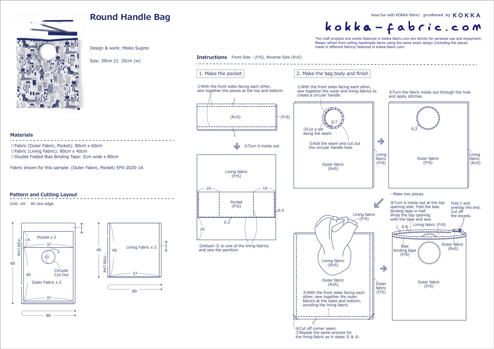 The charm of this bag is the cut-out circular handle. The bag’s shape is simple, yet it has a pocket on the inside. Taking advantage of the black color of the pattern, the opening is wrapped with black bias binding tape to give a crisp look.