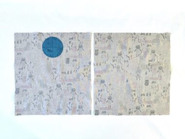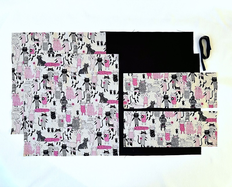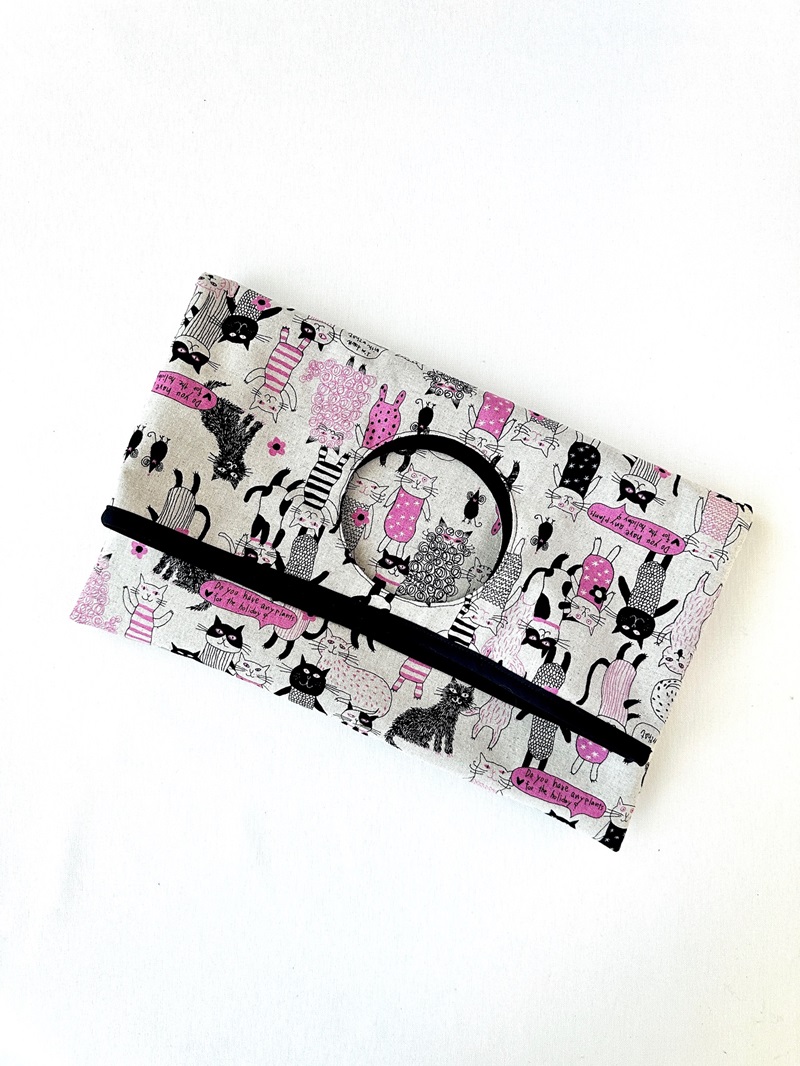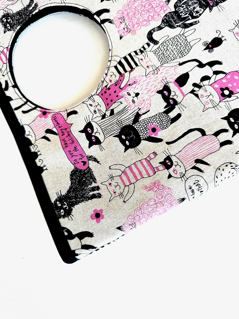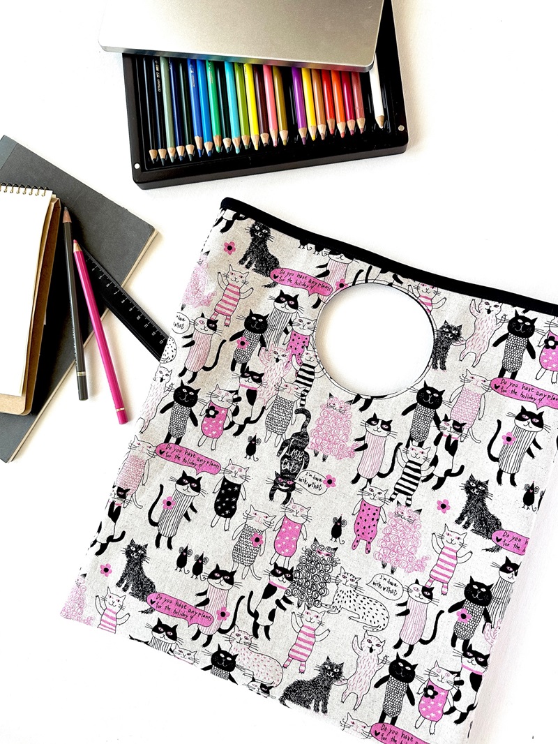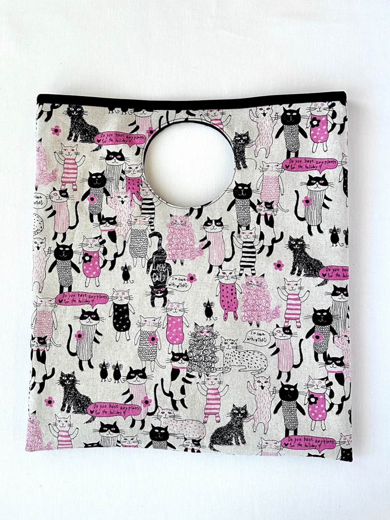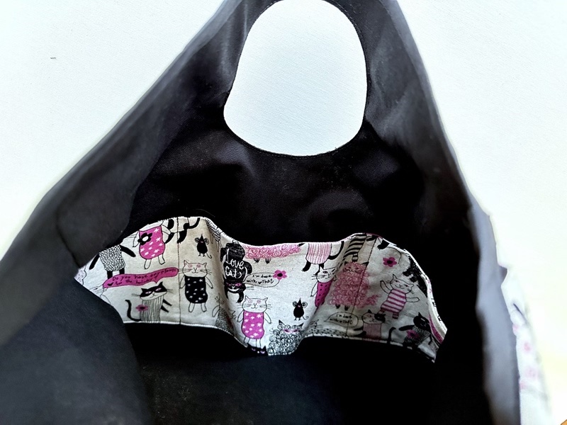 The charm of this bag is a cut-out circular handle. When folded, you can also carry it as a clutch bag. Another nice feature is that it is reversible. The fabric used for this bag is from the “SPELL BY MIA” series. Cats with unique personalities cover the entire surface. The cotton linen canvas is perfect for bag making.