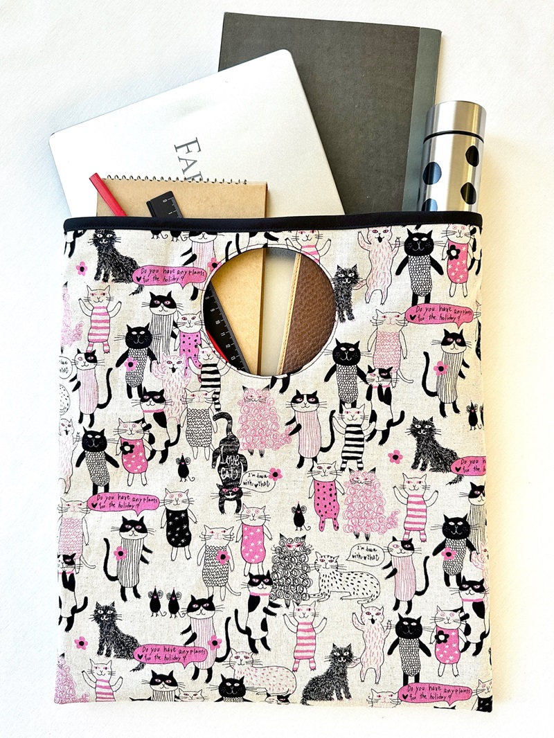 It is large enough to comfortably hold an A4-sized file horizontally, making it convenient for carrying files and other items. It is reversible, so you can use the black side for work and the cat side for fun.