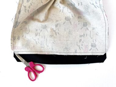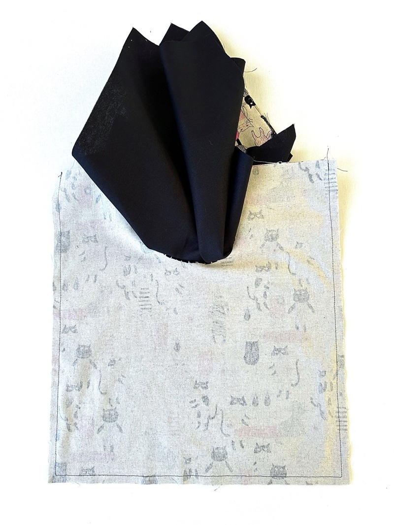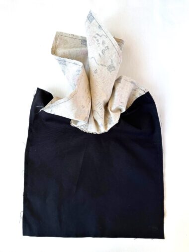 With the front sides facing each other, sew together the lining fabrics at the sides and bottom.