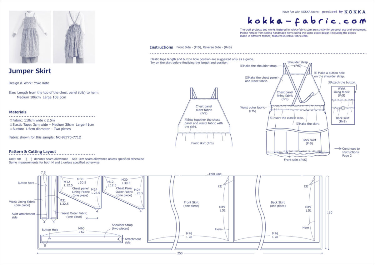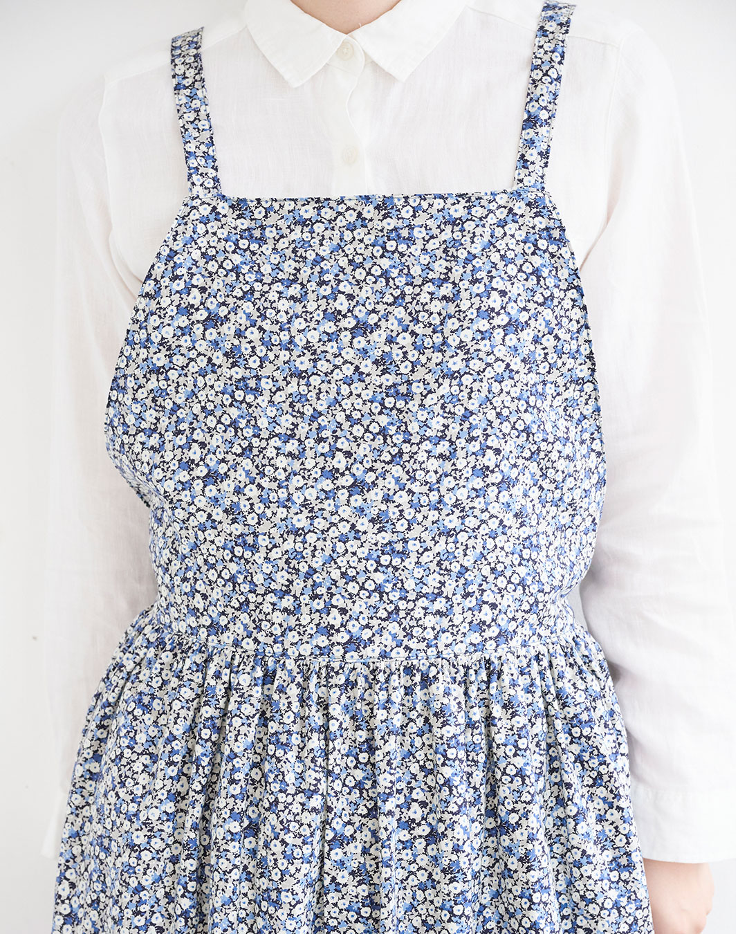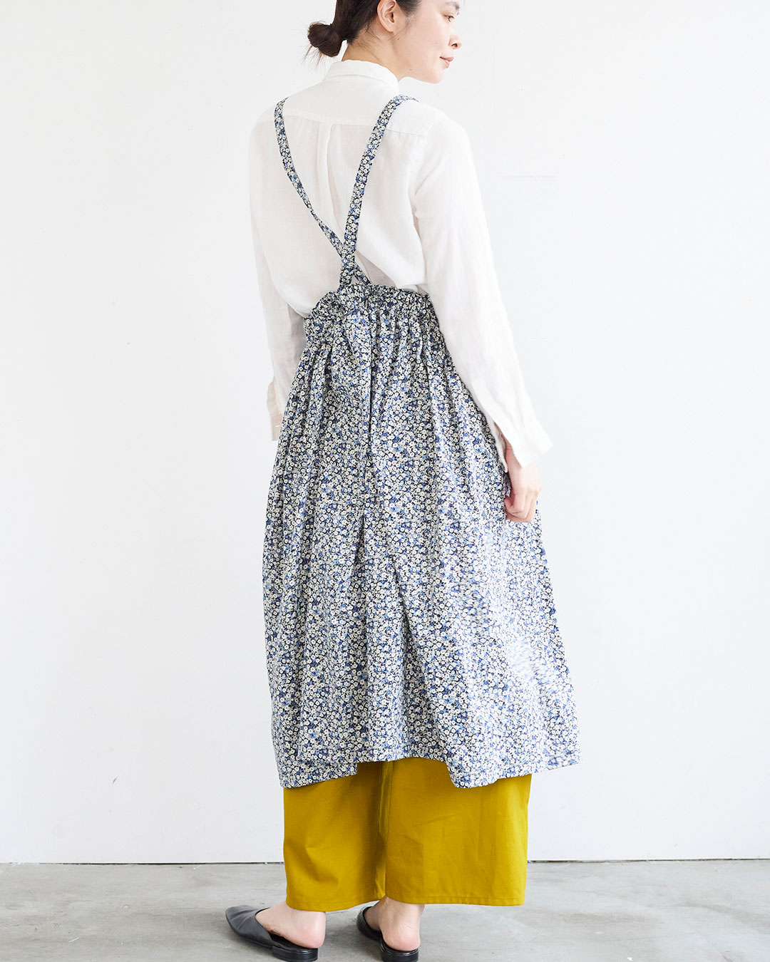 This jumper skirt resembles an apron dress. During colder seasons, you can enjoy it with pants or a long skirt for a stylish layered look. The gathered waist features an elastic band only at the back, creating a clean silhouette. The fabric used for this skirt is a 30 Viera with a delicate, slightly-brushed texture and a charming floral print. The brushing process for a soft finish makes this fabric exceptionally silky and comfortable-to-the-touch.