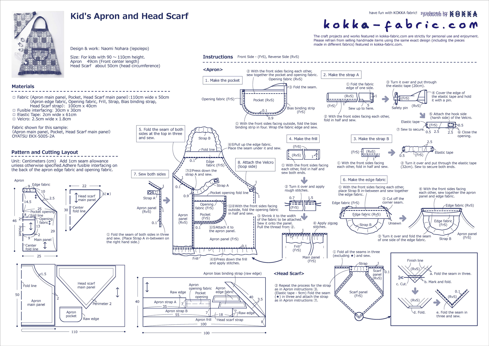 Fabric shown for this sample:(Apron main panel, Pocket, Head Scarf main panel)OYATSU EKX-5005-2A
