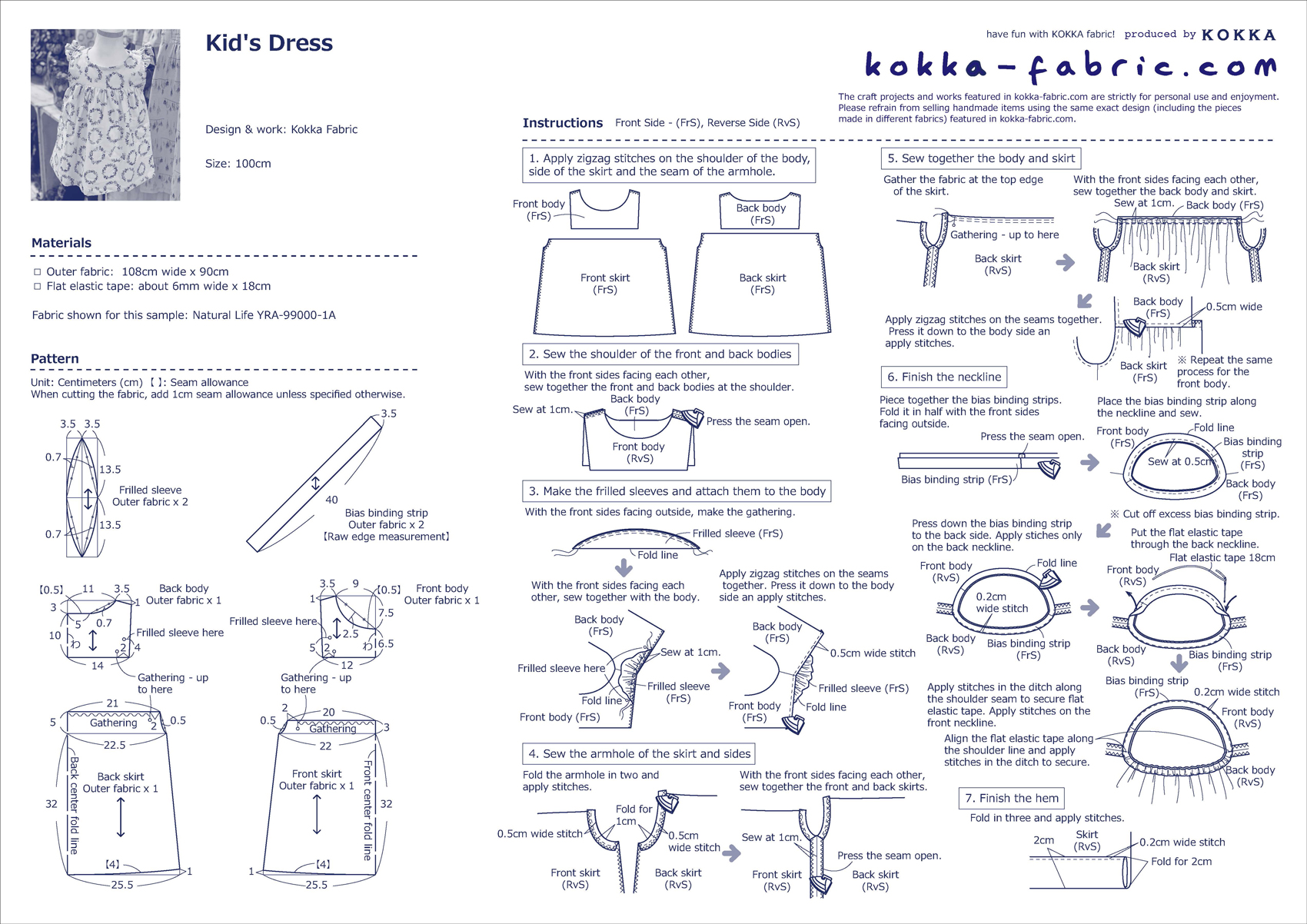 This kid’s dress is very lovely with frilled sleeves. The featured fabric, Natural Life series comes in a soft color tone of a flower and plant wreath design. This nice-textured cotton 100% double gauze is perfect for making kid’s clothing and baby items.