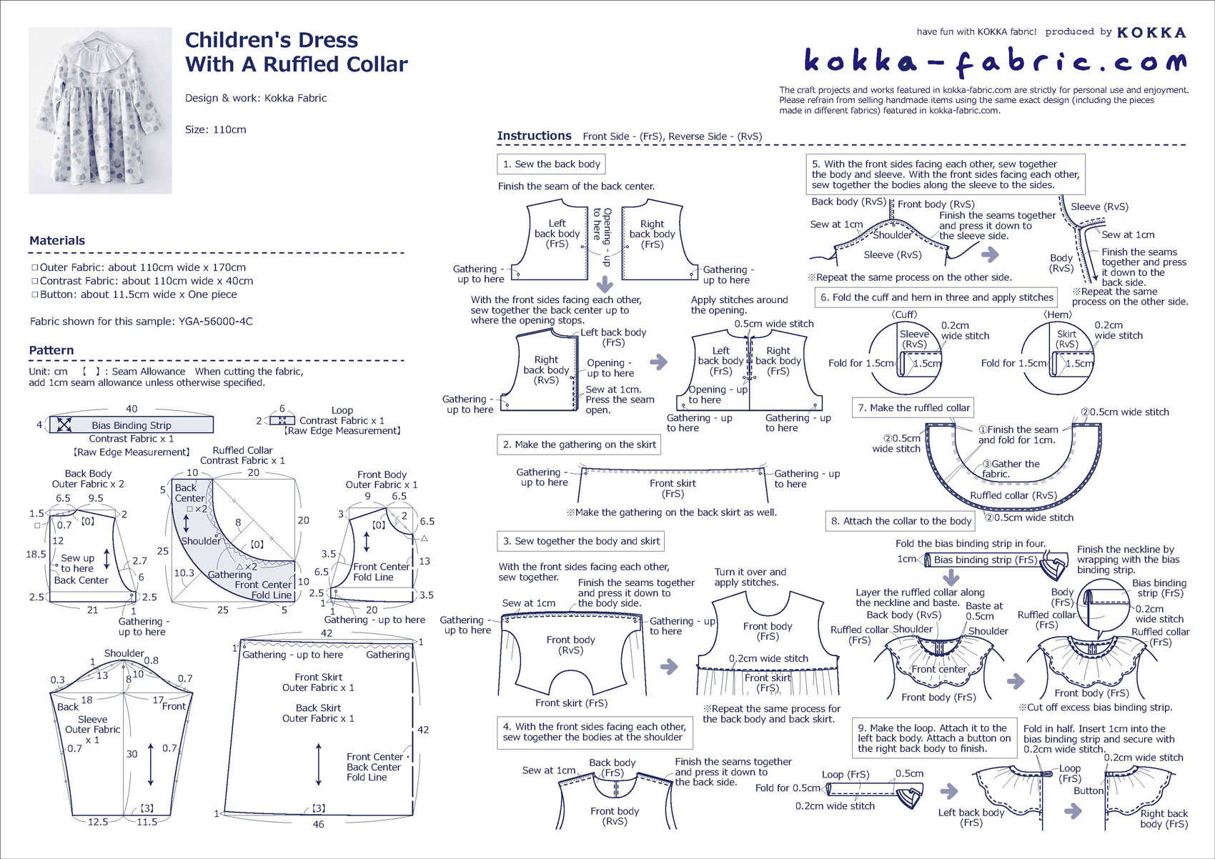 This is a lovely children’s dress with a large ruffled collar. The featured fabric is from the “Color of Character” series. The polka-dot pattern can be sewn without worrying about matching the top and bottom or the pattern. This 100% cotton sheeting is perfect for dress making as it is easy to sew.