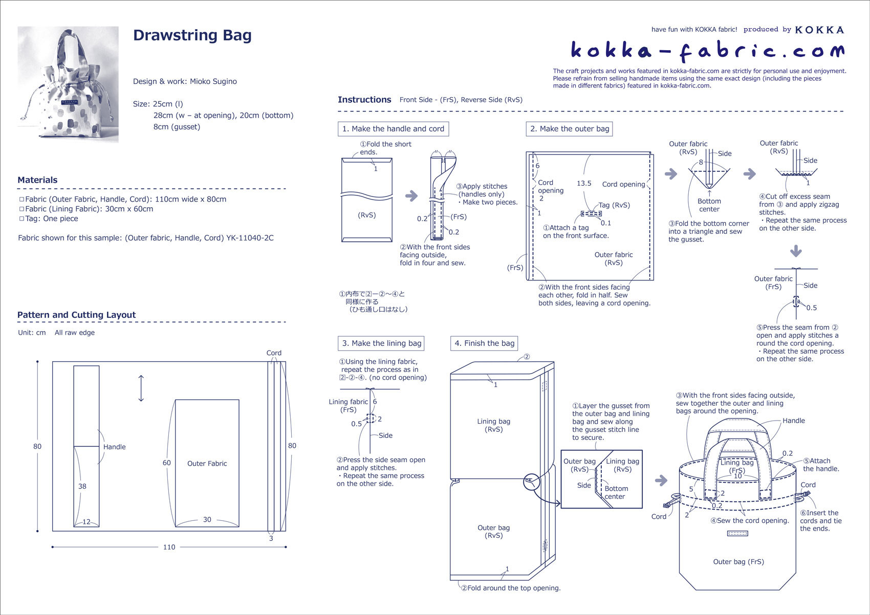 - Fabric (Outer Fabric, Handle, Cord): 110cm wide x 80cm