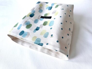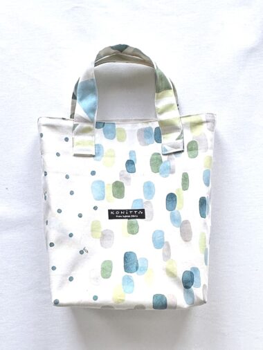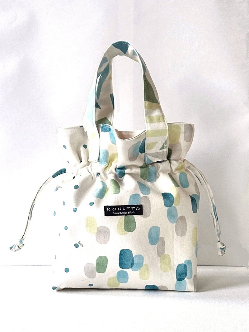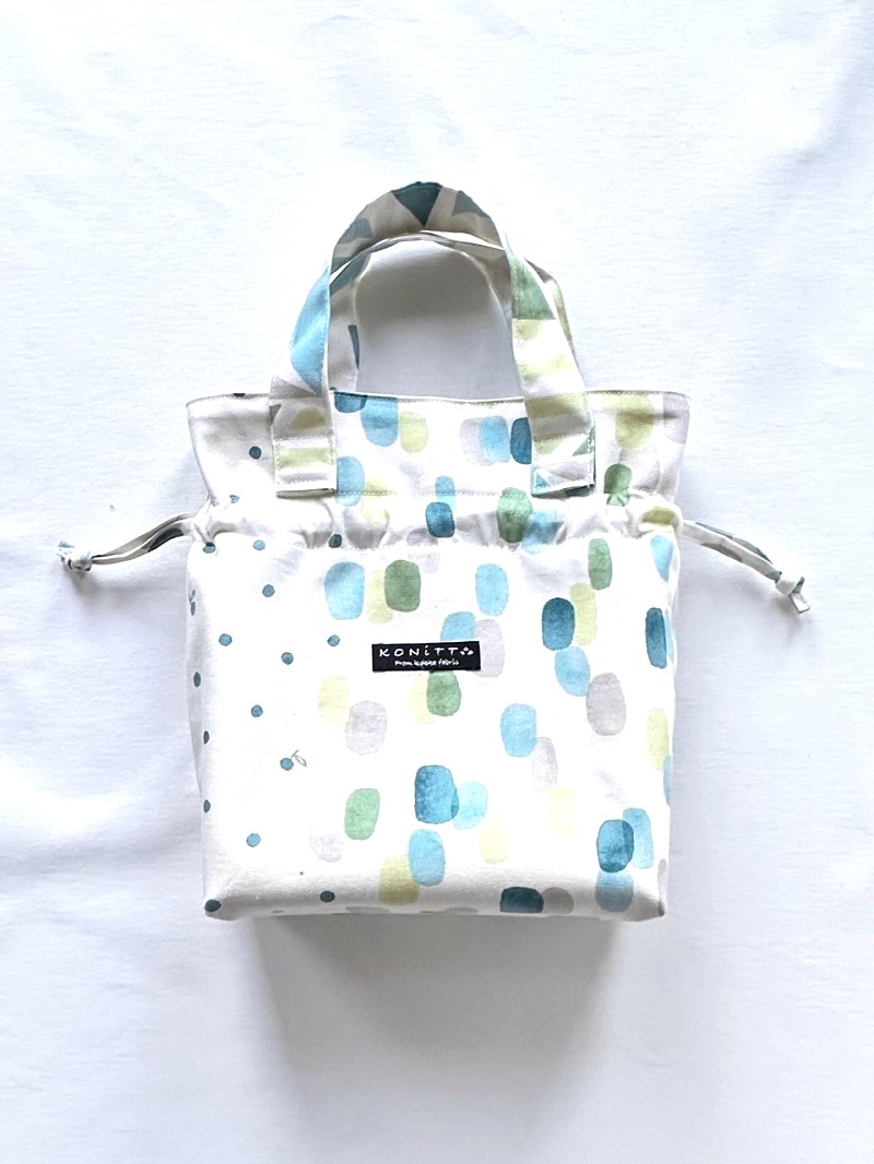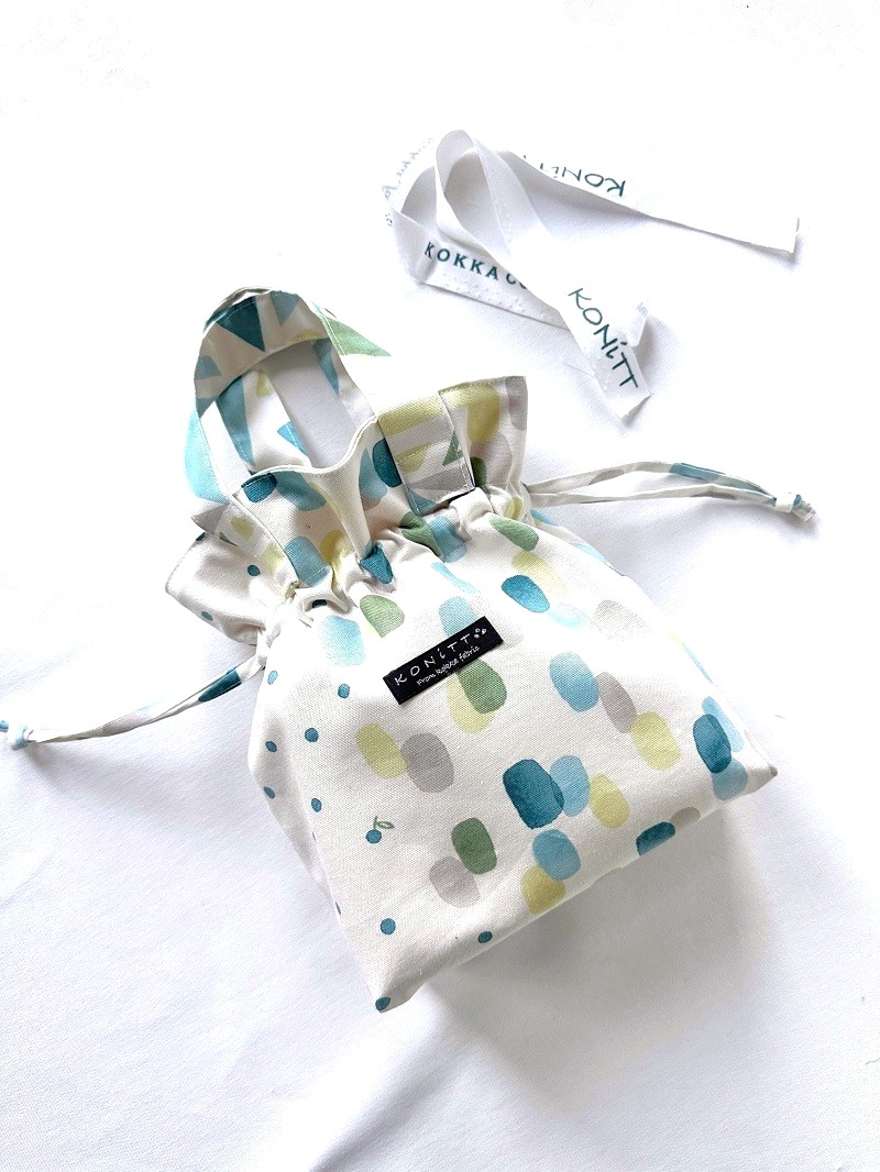 This drawstring bag has a lovely round shape. The fabric used for this bag is from the “KONiTT” series, a textile brand that was born from listening to firsthand ideas of handicraft artists. The outer fabric, handles, and cords are made of “Marusankaku Shikaku” with three different patterns. 100% cotton oxford. Easy to cut and sew, this fabric is perfect for making bags.